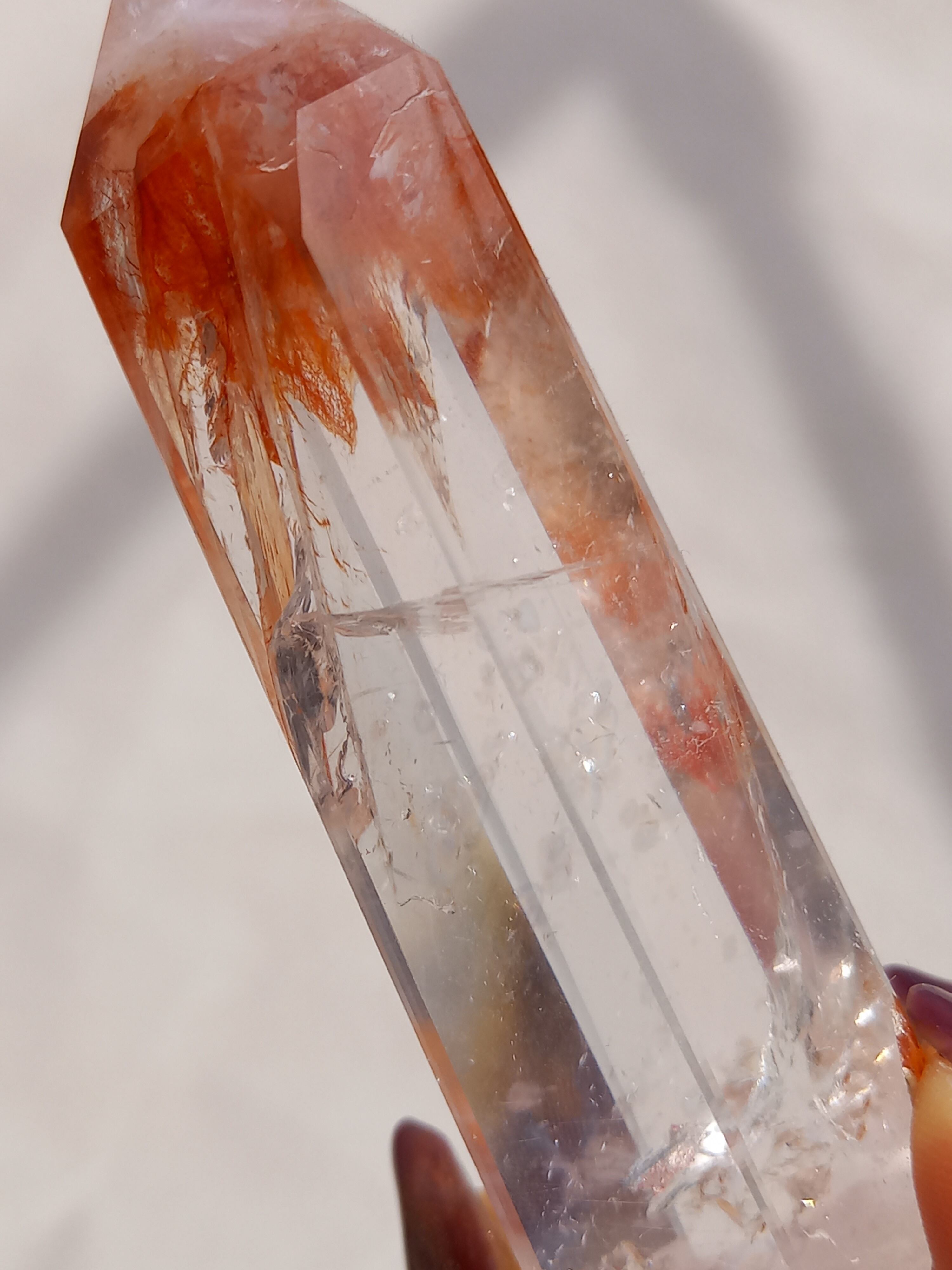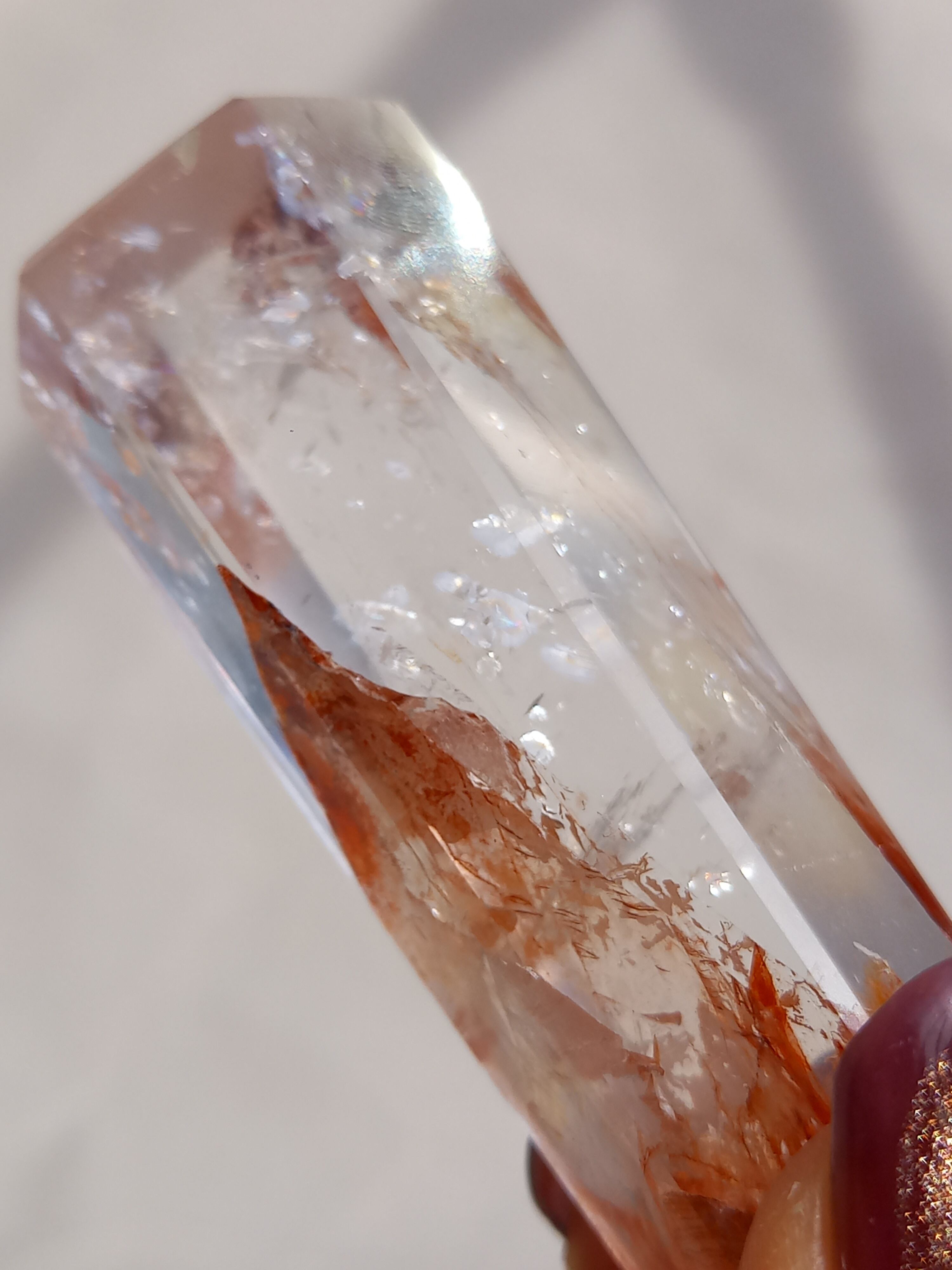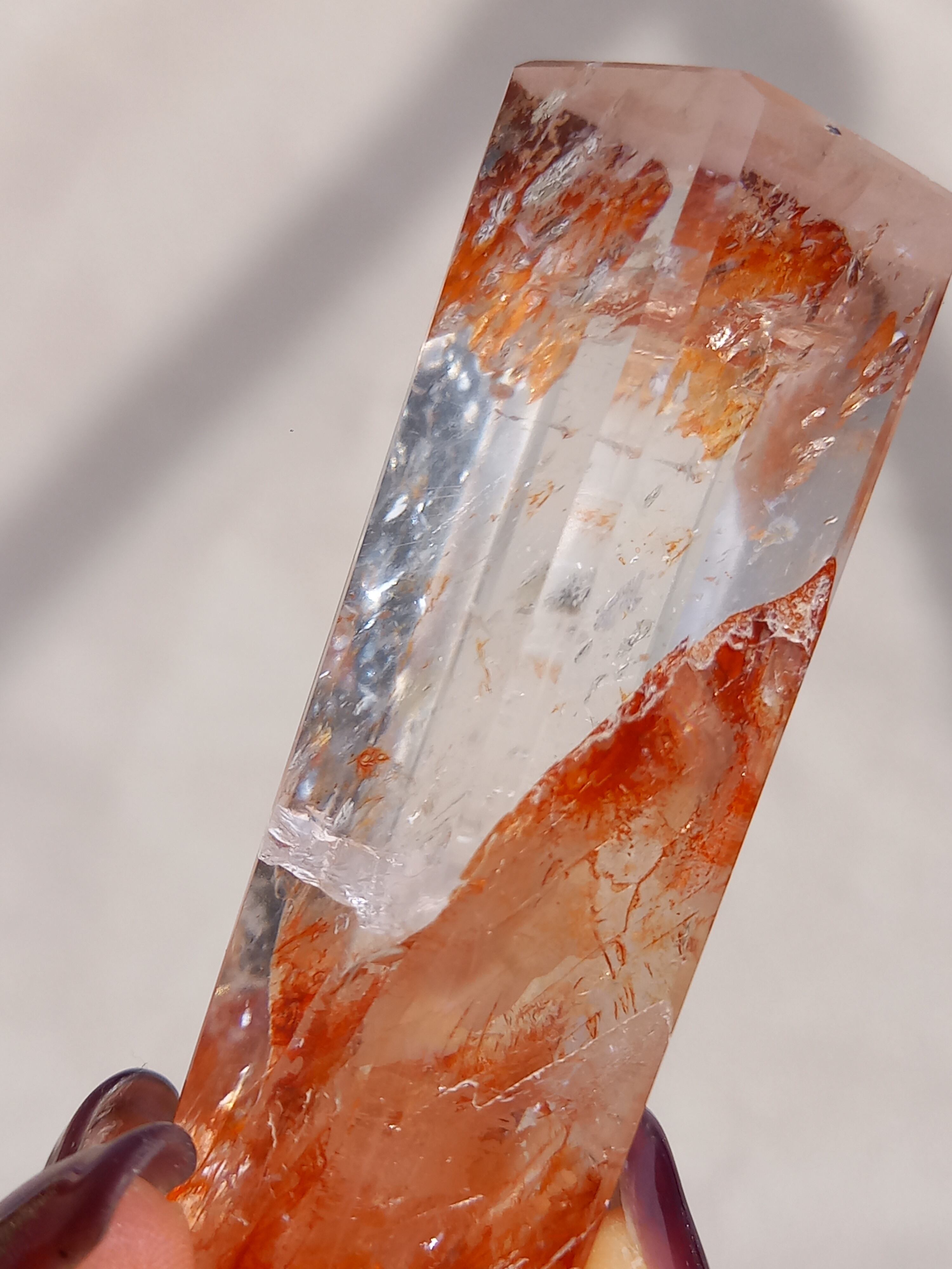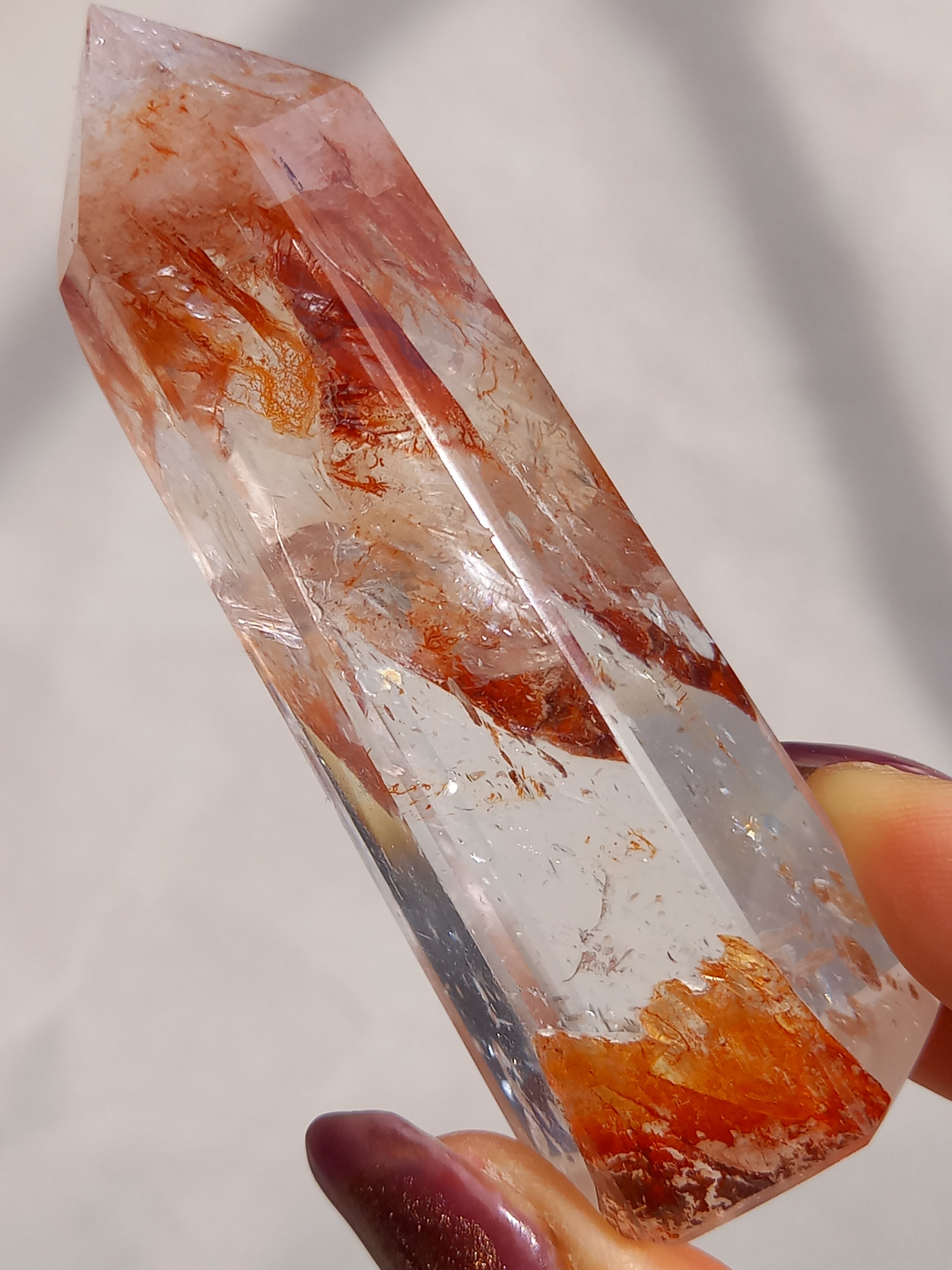 透明感抜群のクォーツ部分と鮮やかなレッドオレンジカラーに、虹が煌めき、とても素敵なポイントタワーです。