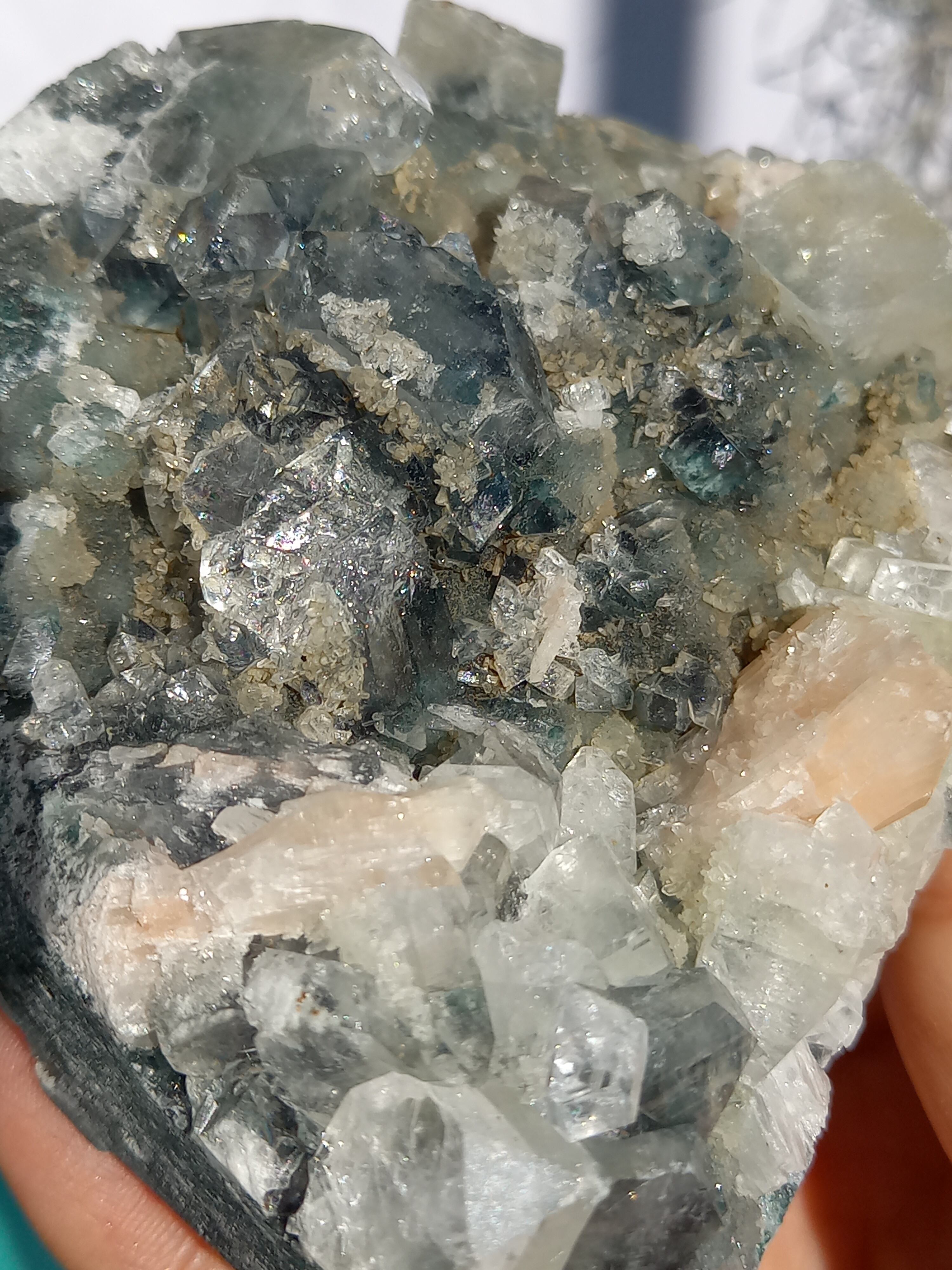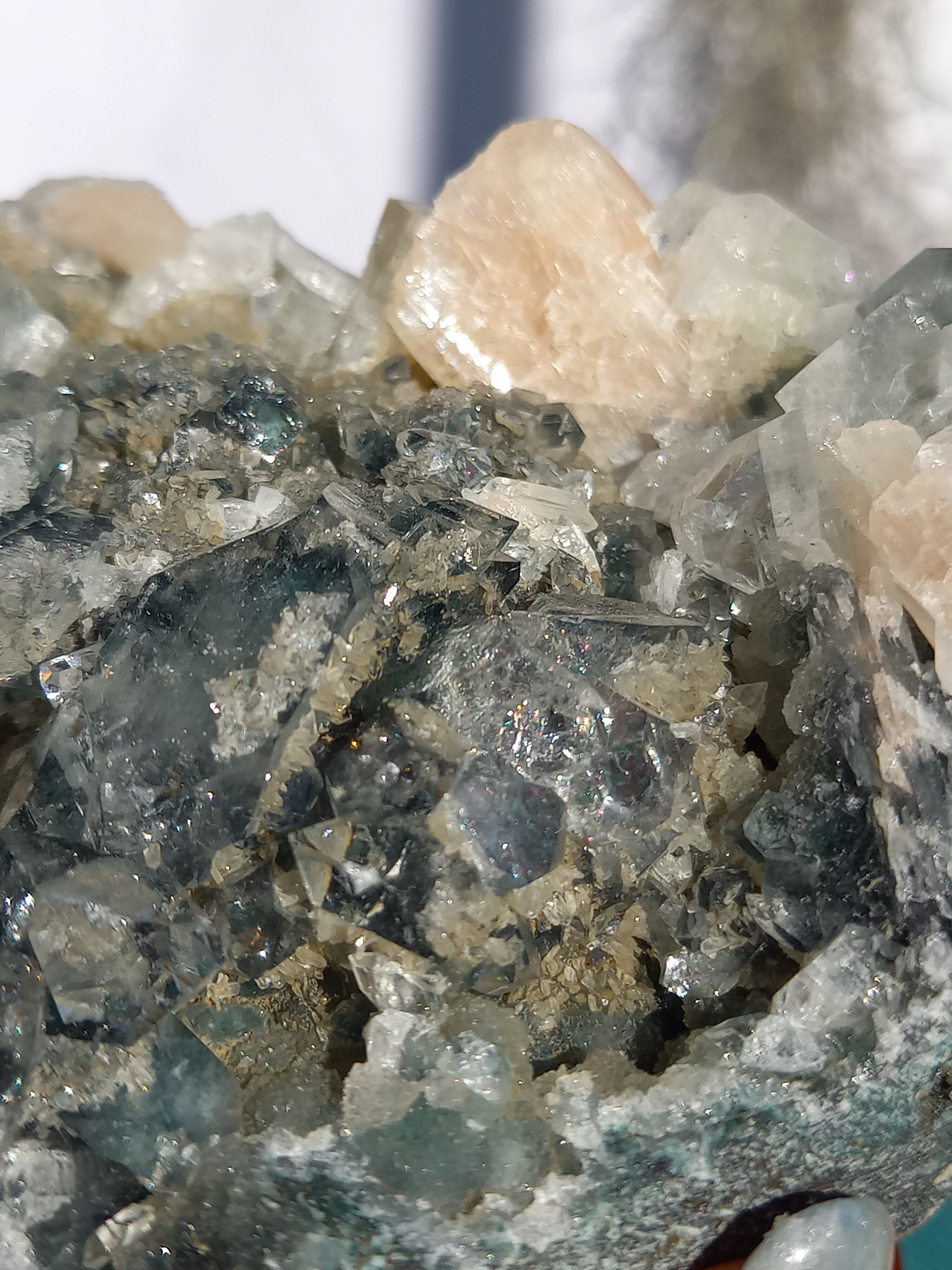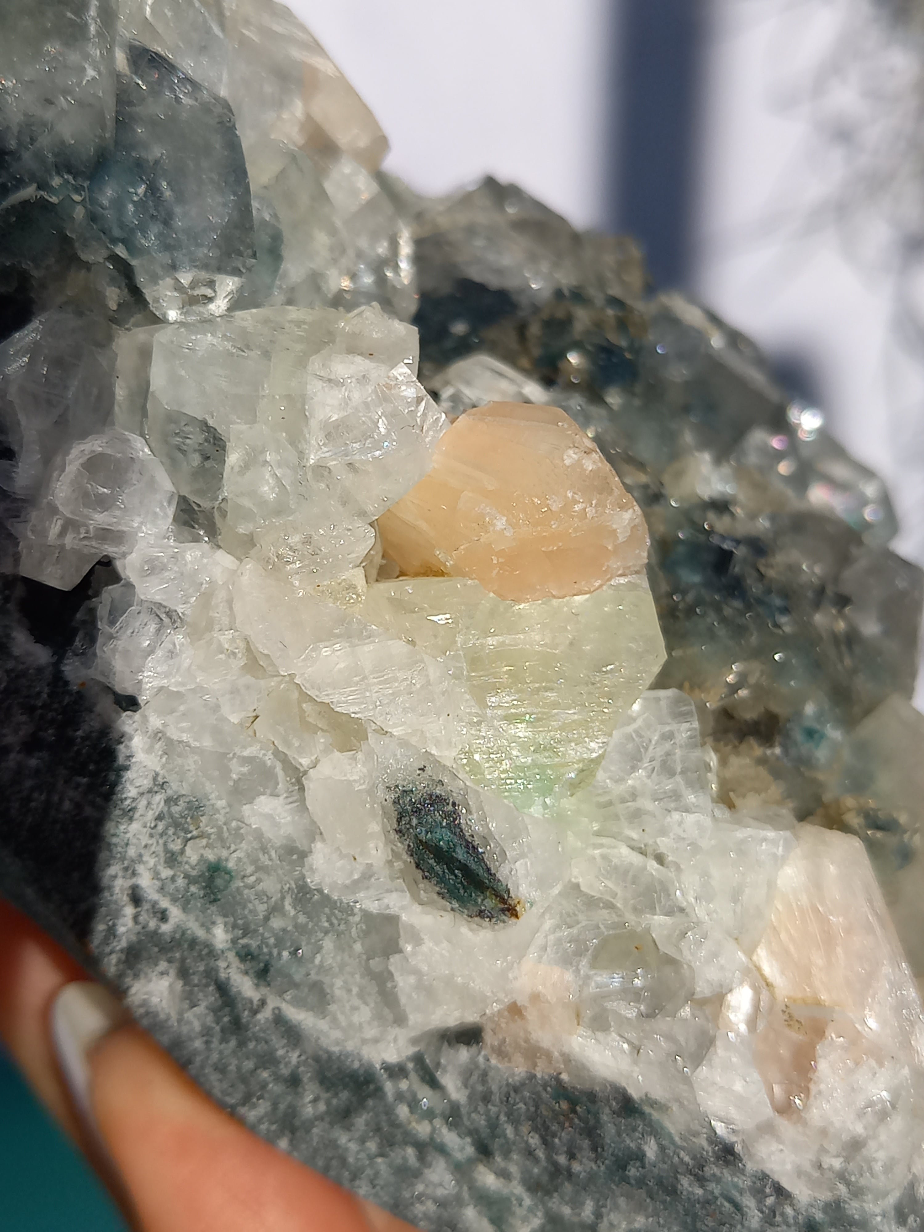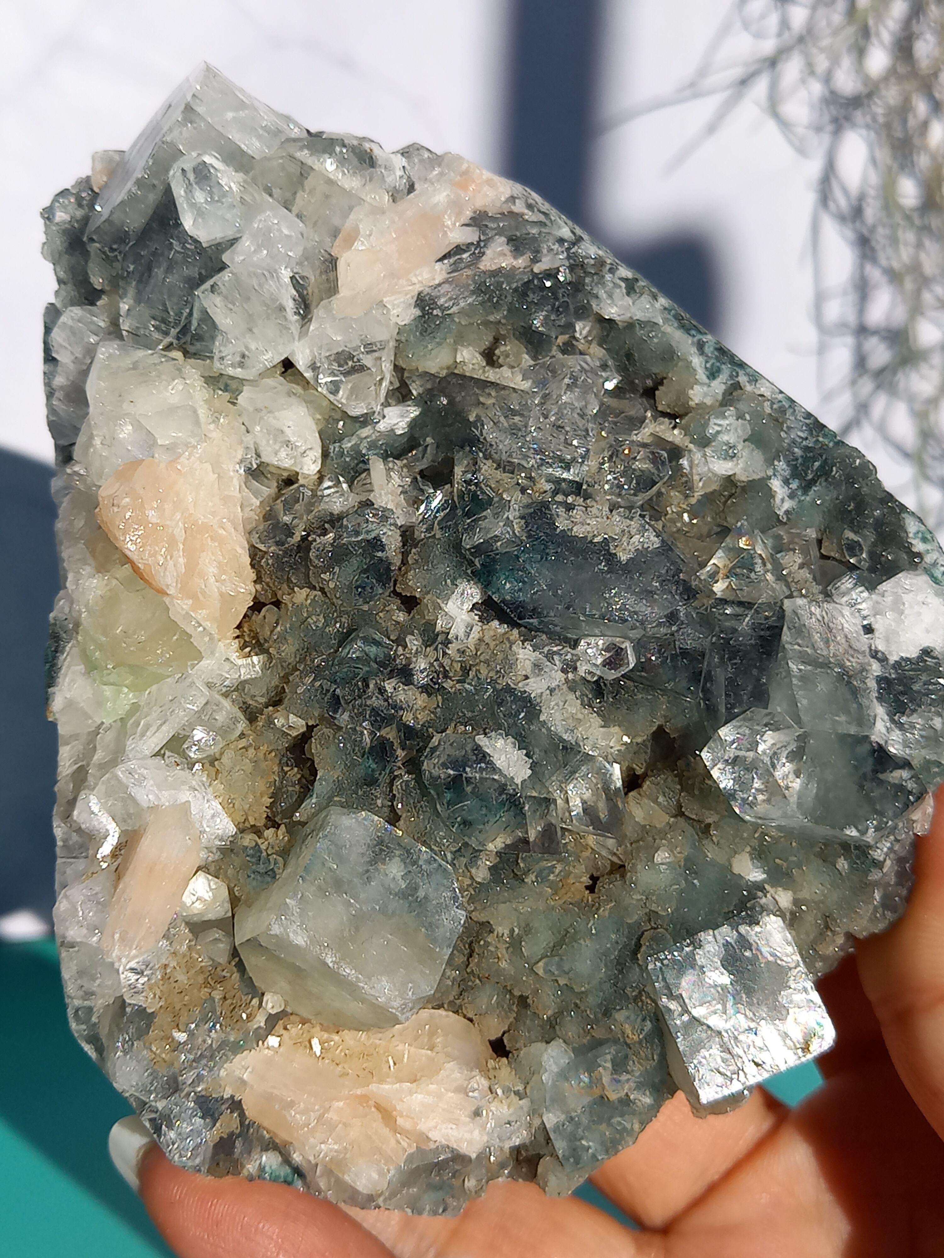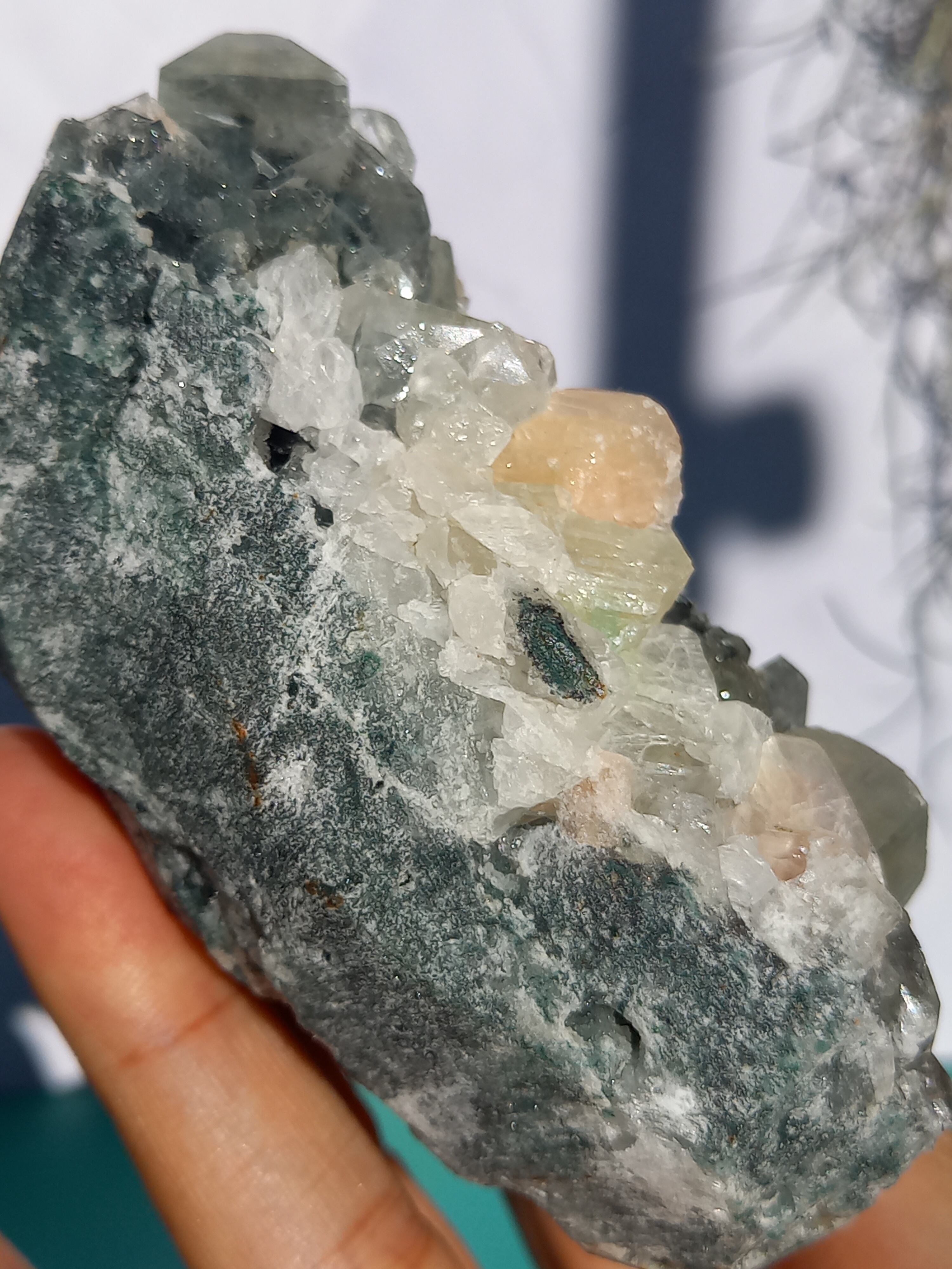 キラキラな透明感あるアポフィライトで、所々あるサーモンピンクの鉱物がスティルバイト、ブルーグレーのモコモコキラキラした部分がスファレライトです。