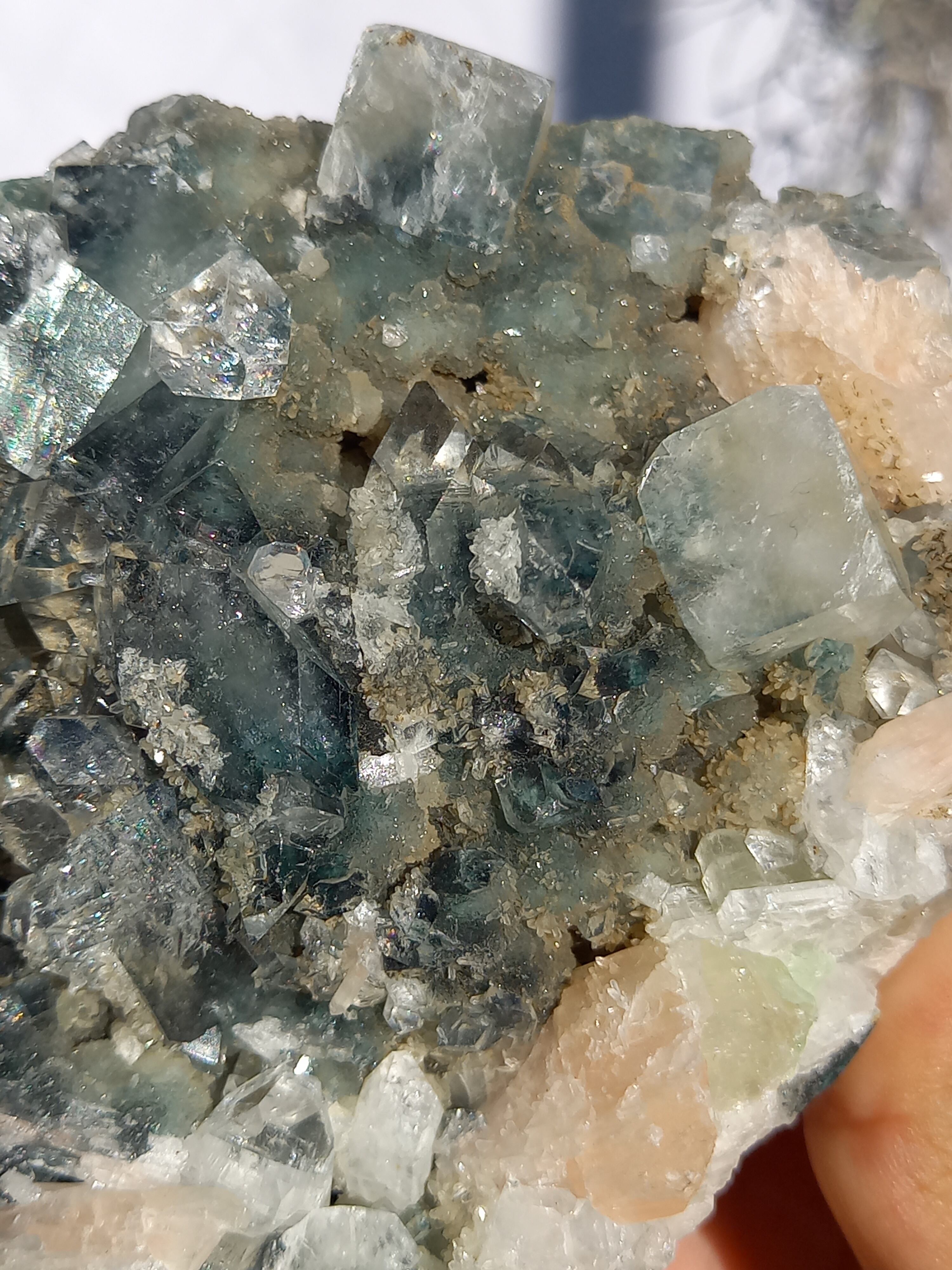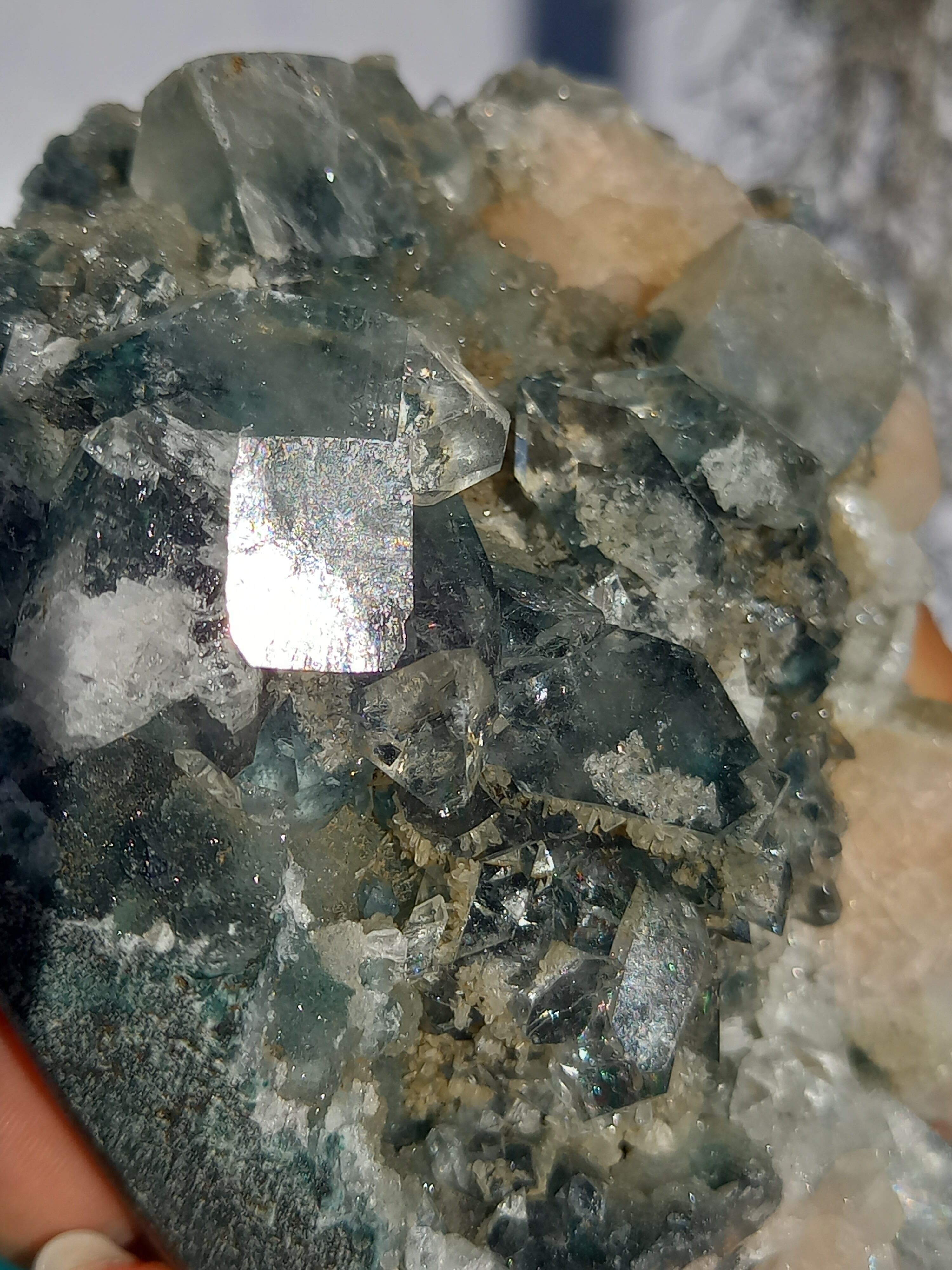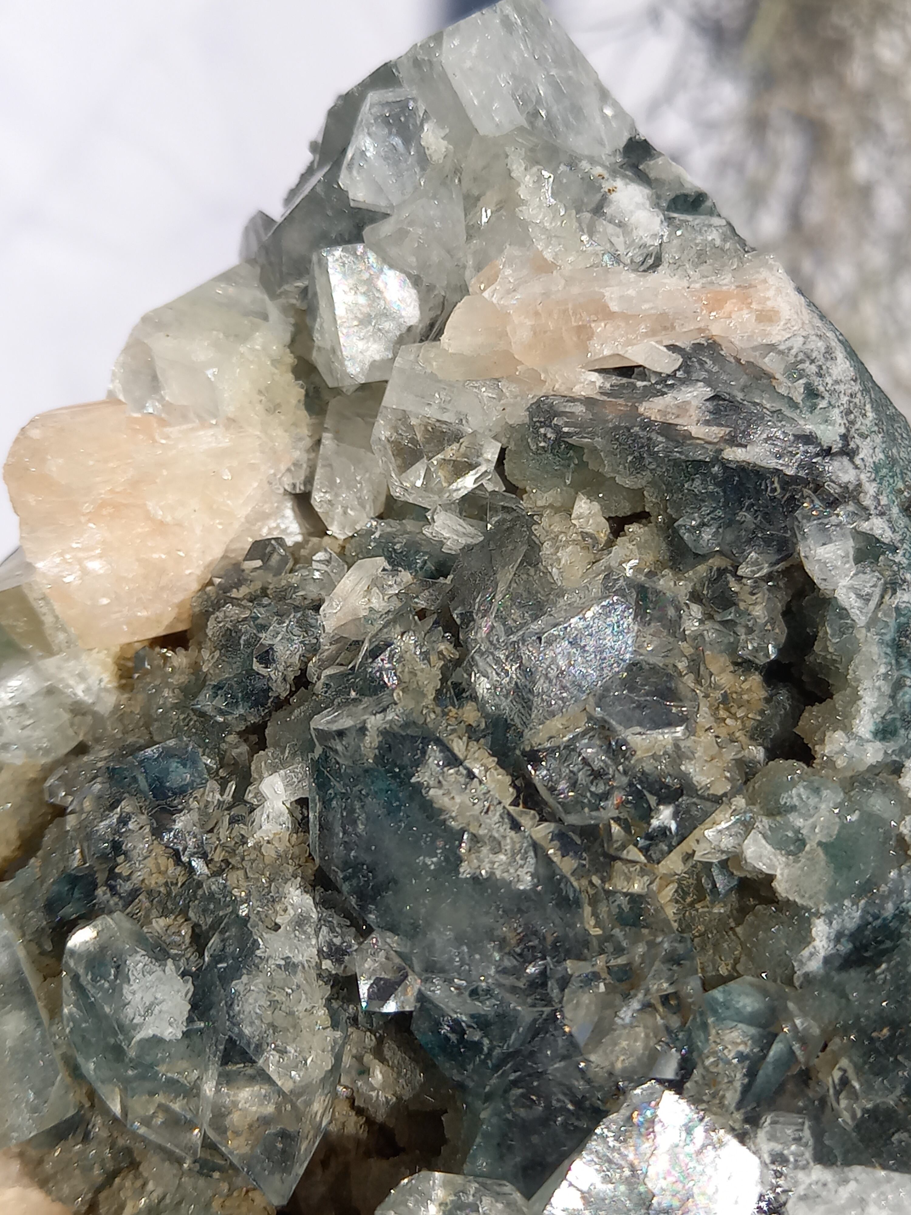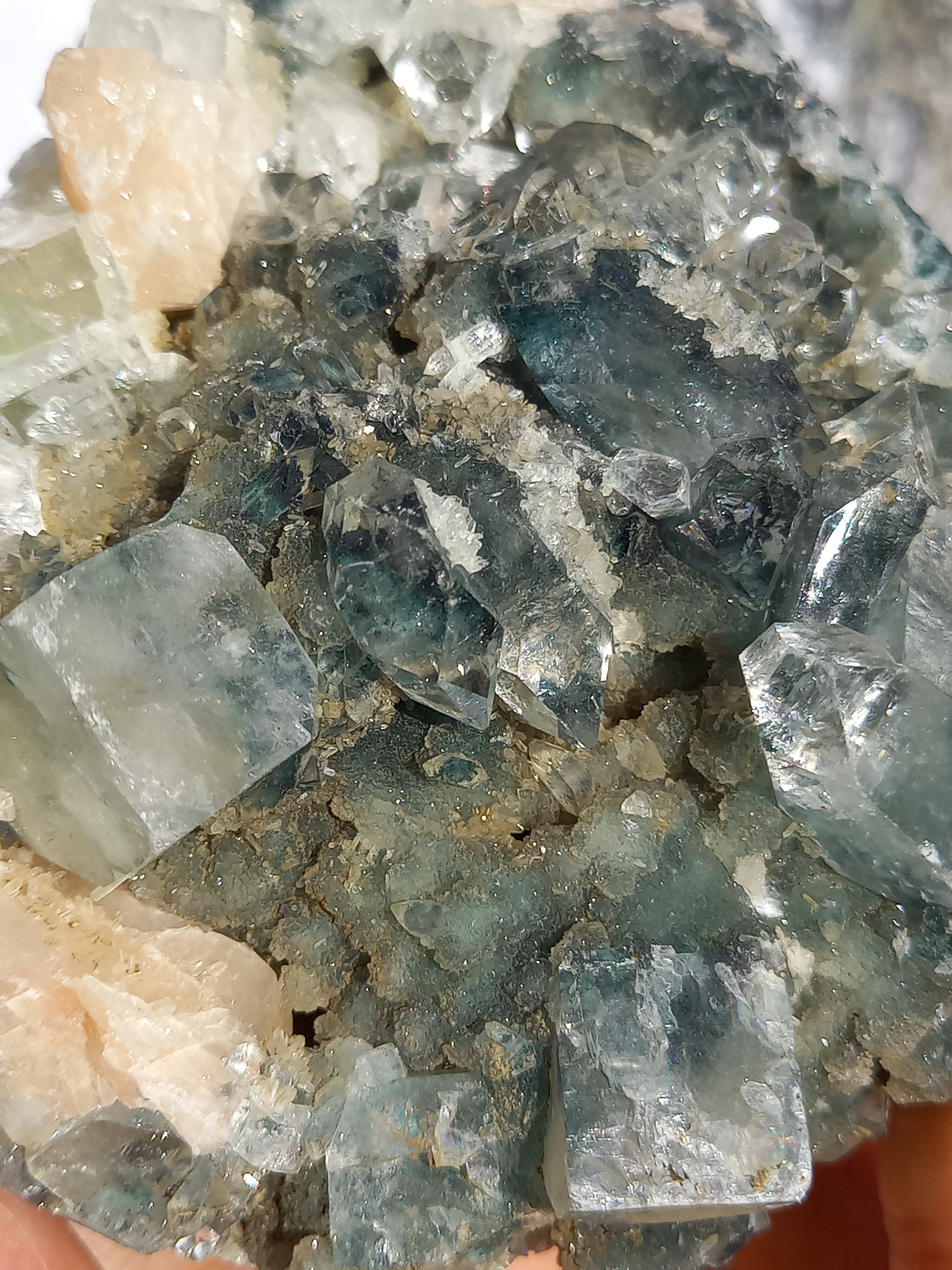 キラキラな透明感あるアポフィライトで、所々あるサーモンピンクの鉱物がスティルバイト、ブルーグレーのモコモコキラキラした部分がスファレライトです。