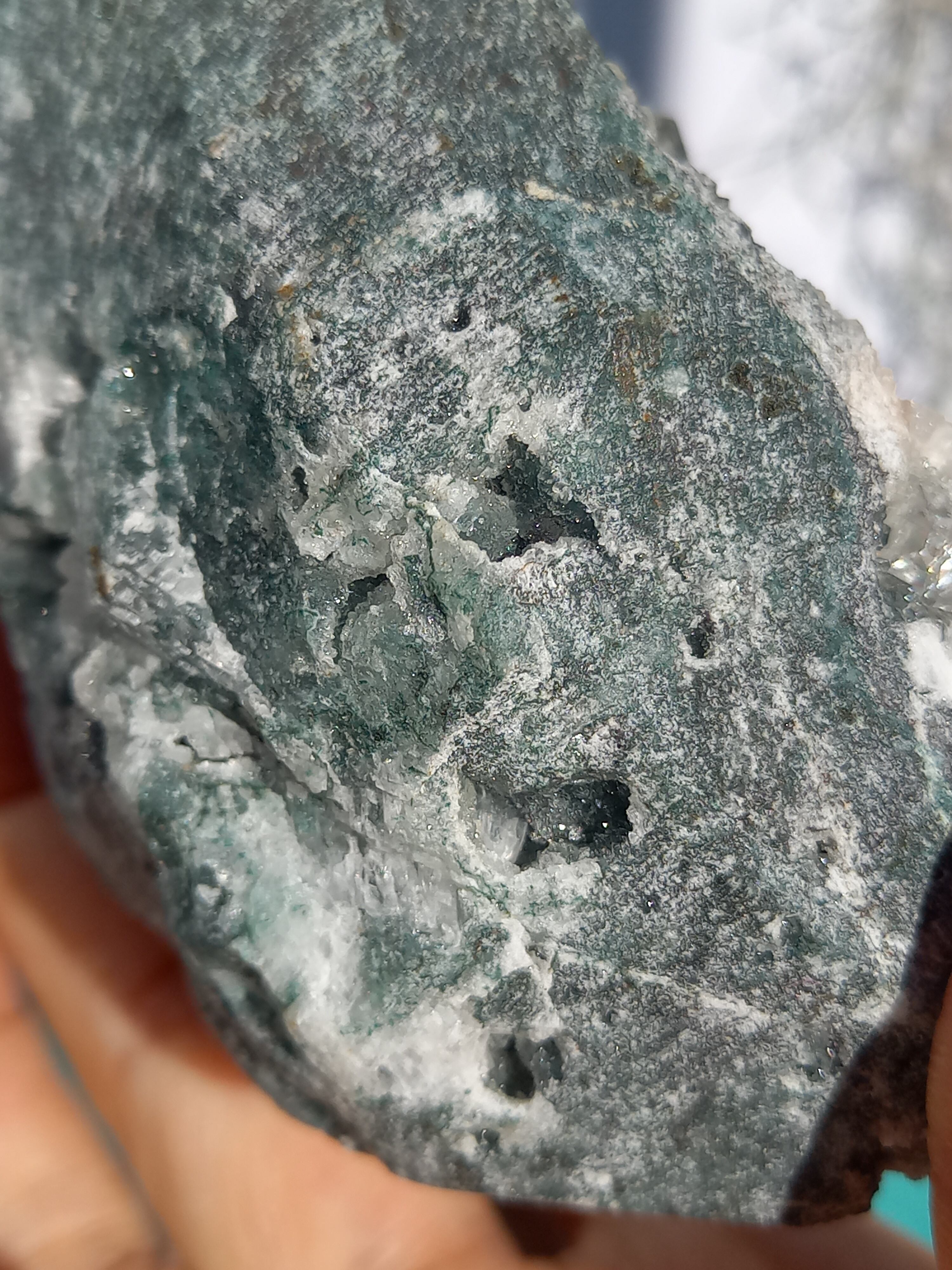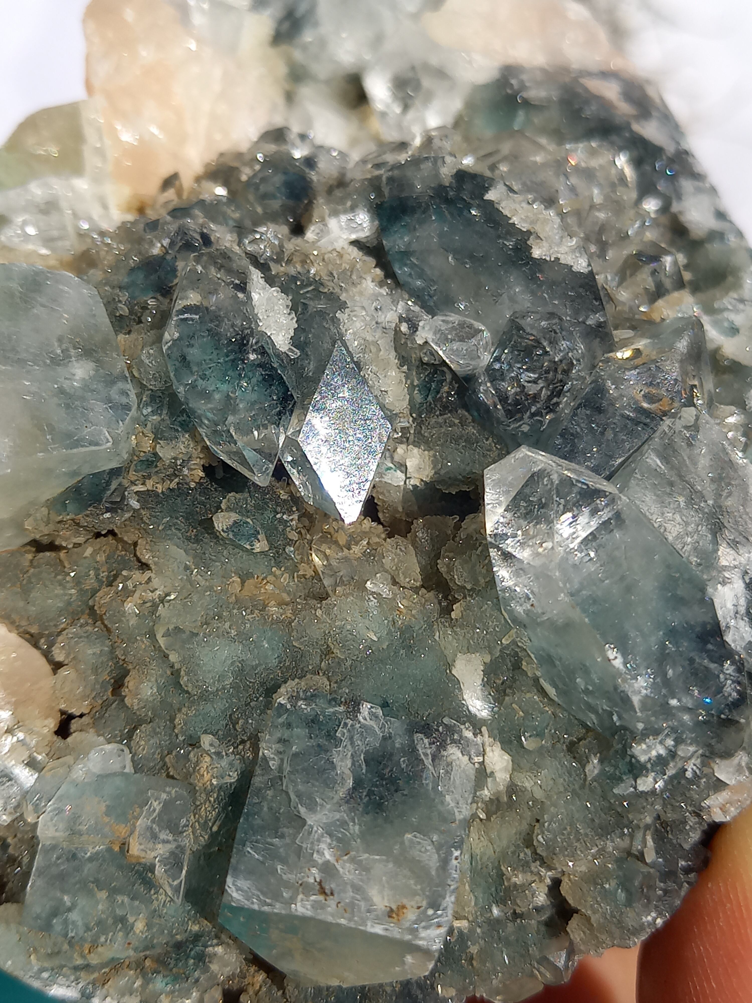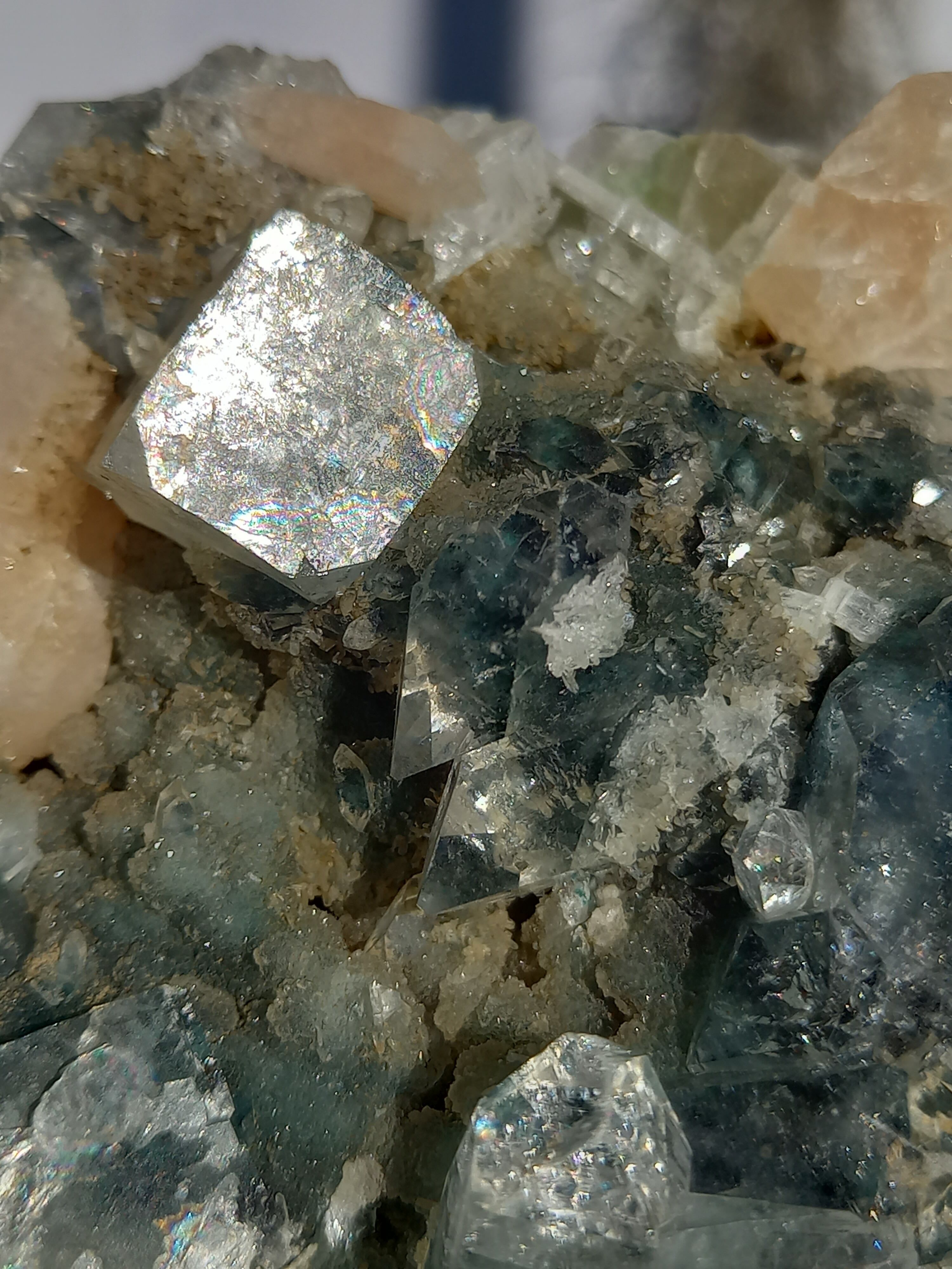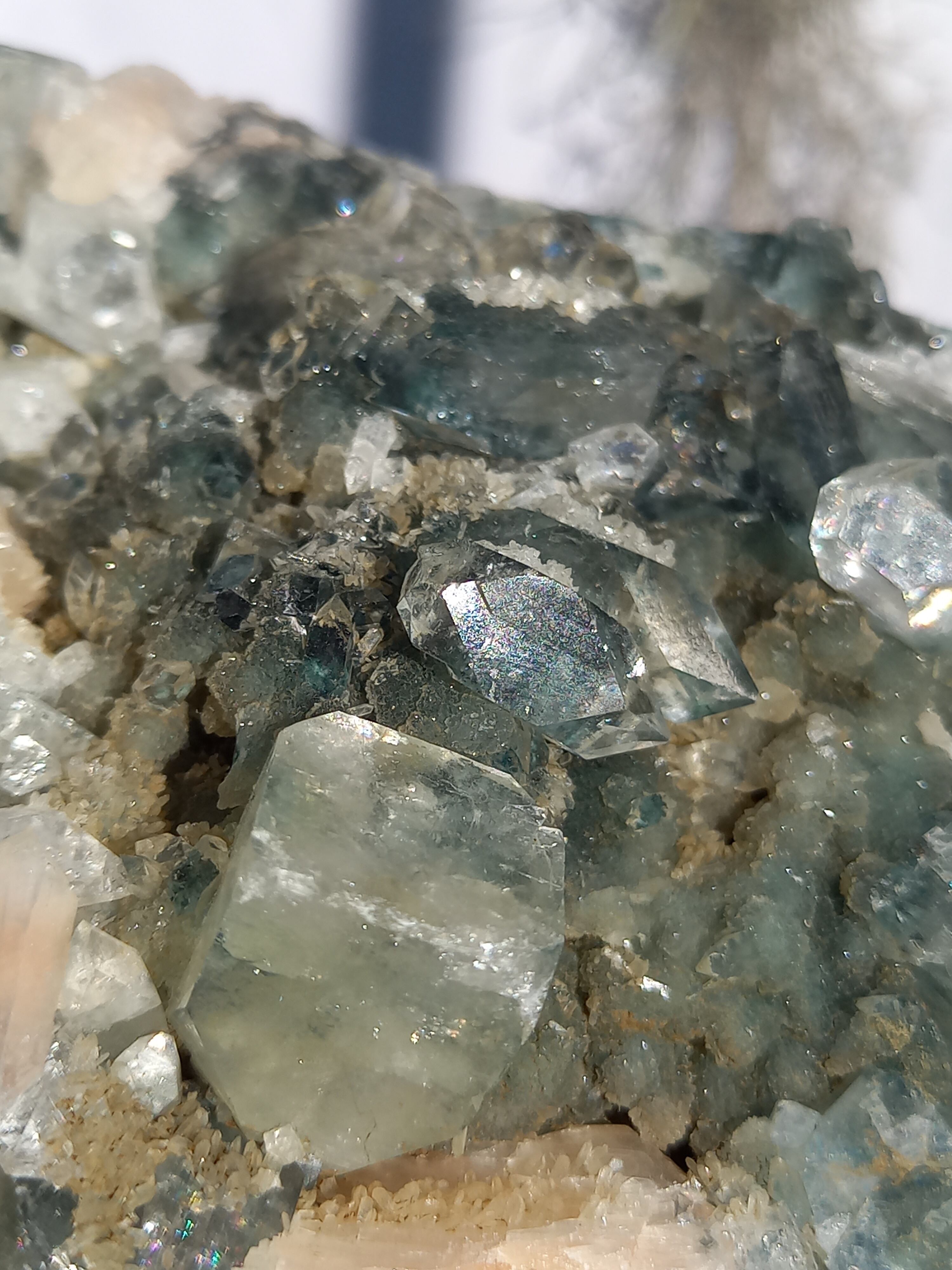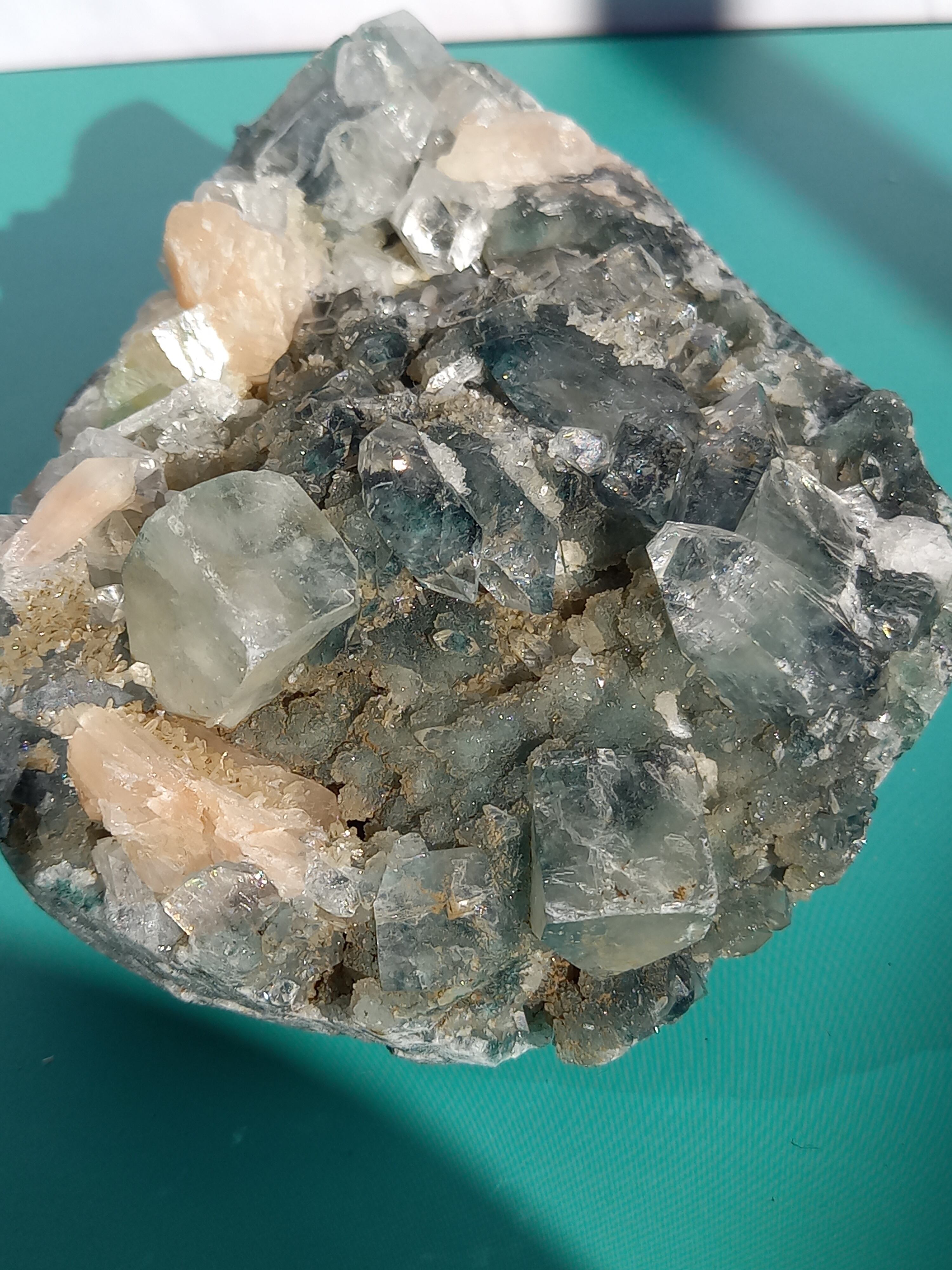 キラキラな透明感あるアポフィライトで、所々あるサーモンピンクの鉱物がスティルバイト、ブルーグレーのモコモコキラキラした部分がスファレライトです。