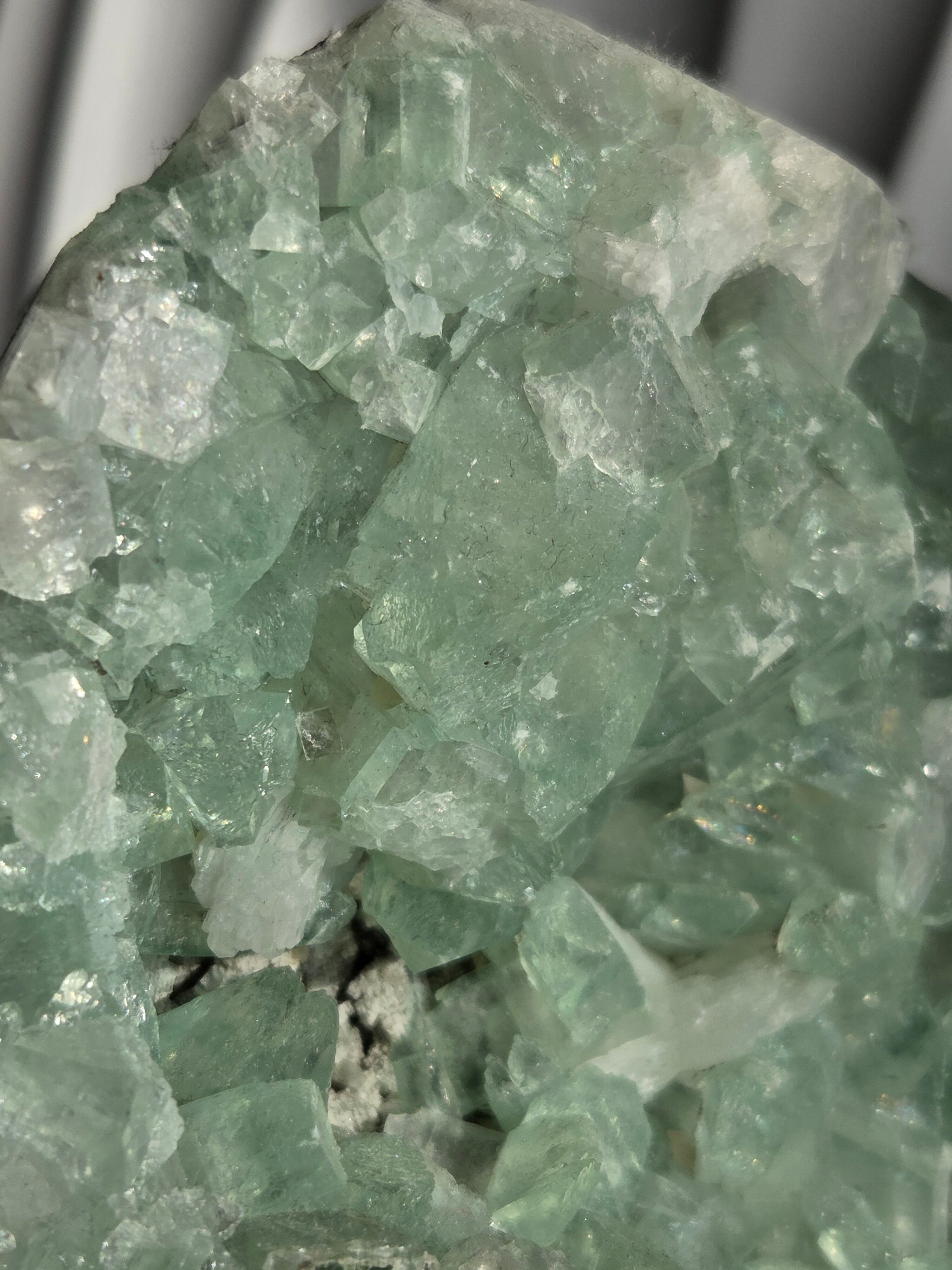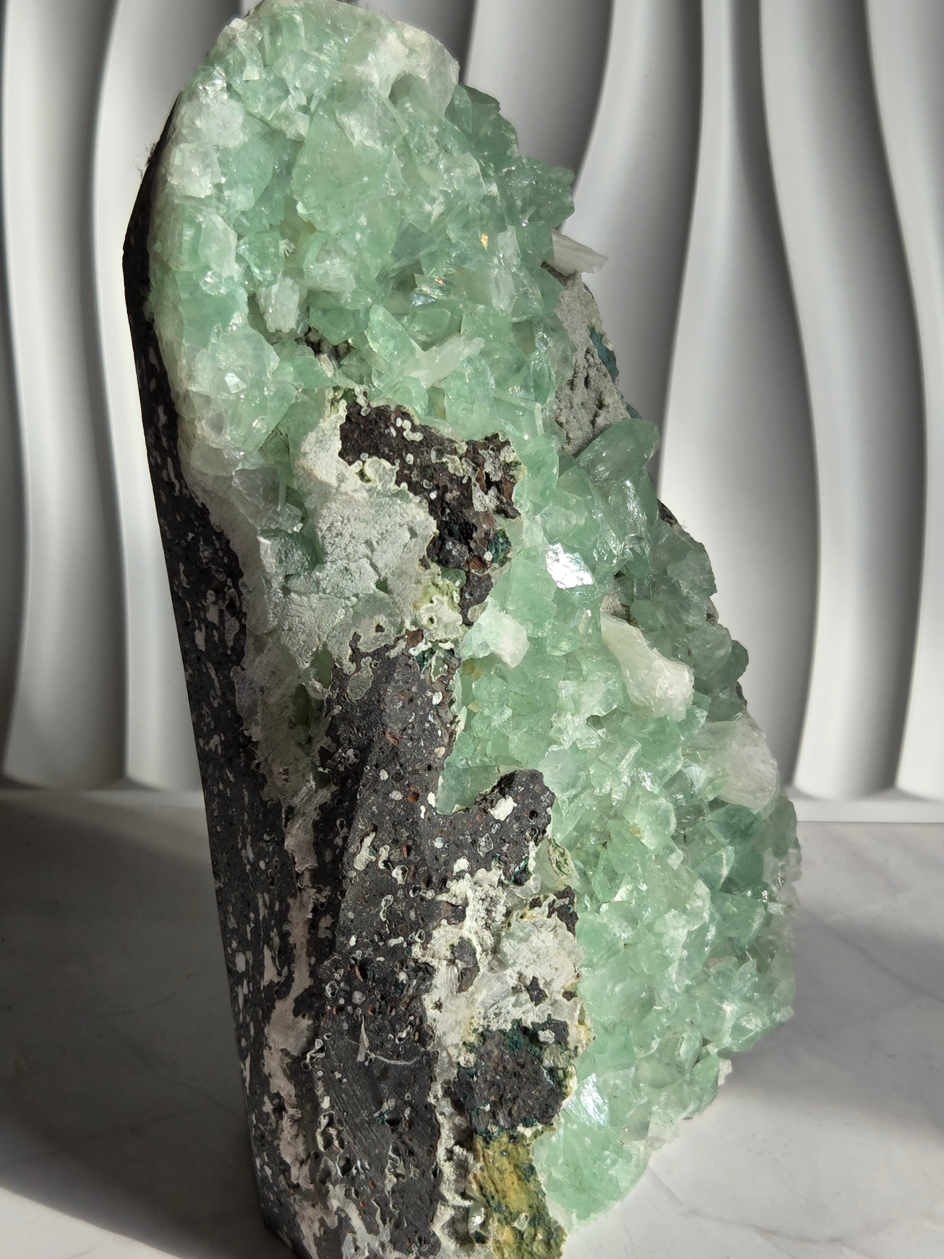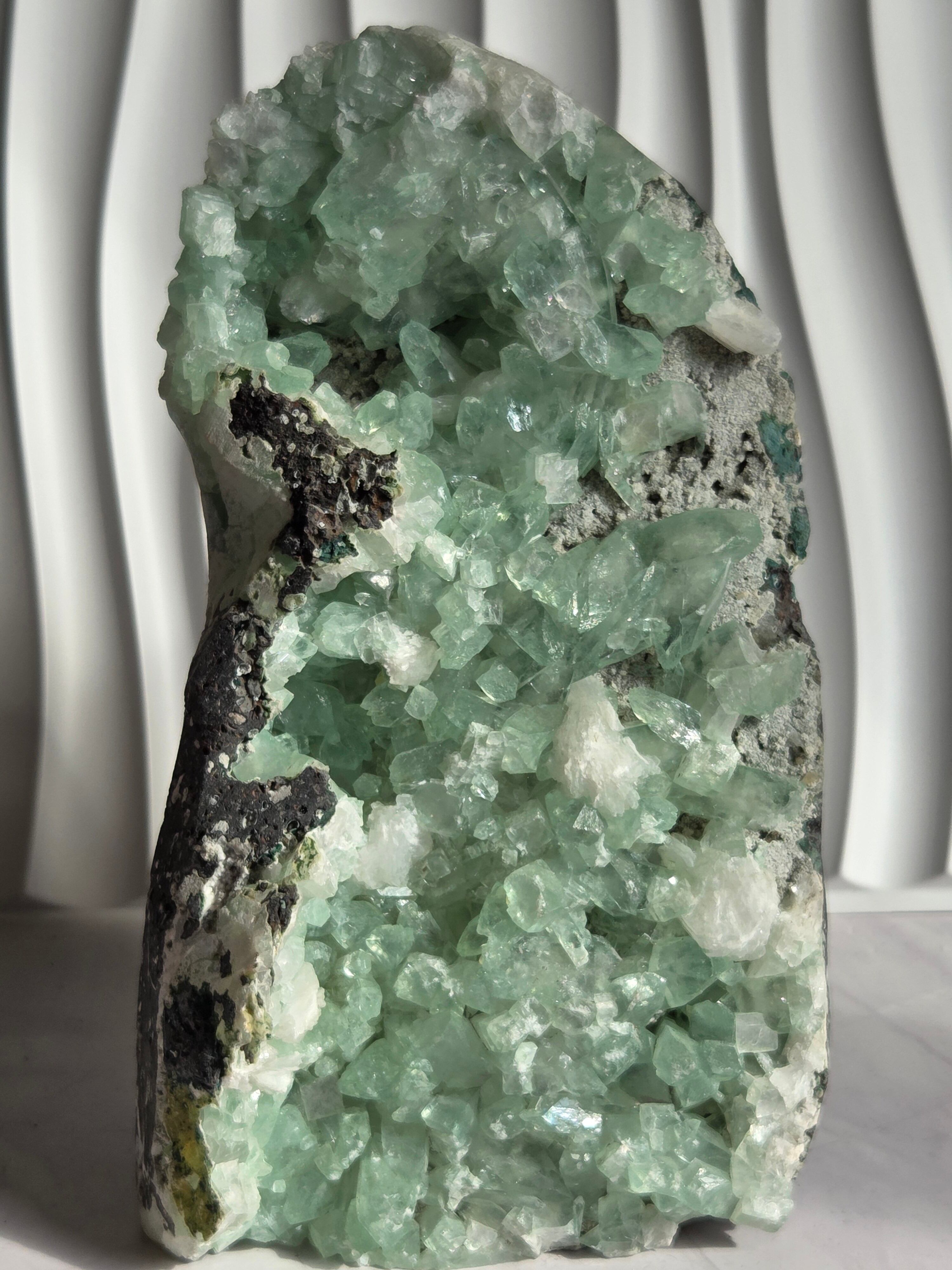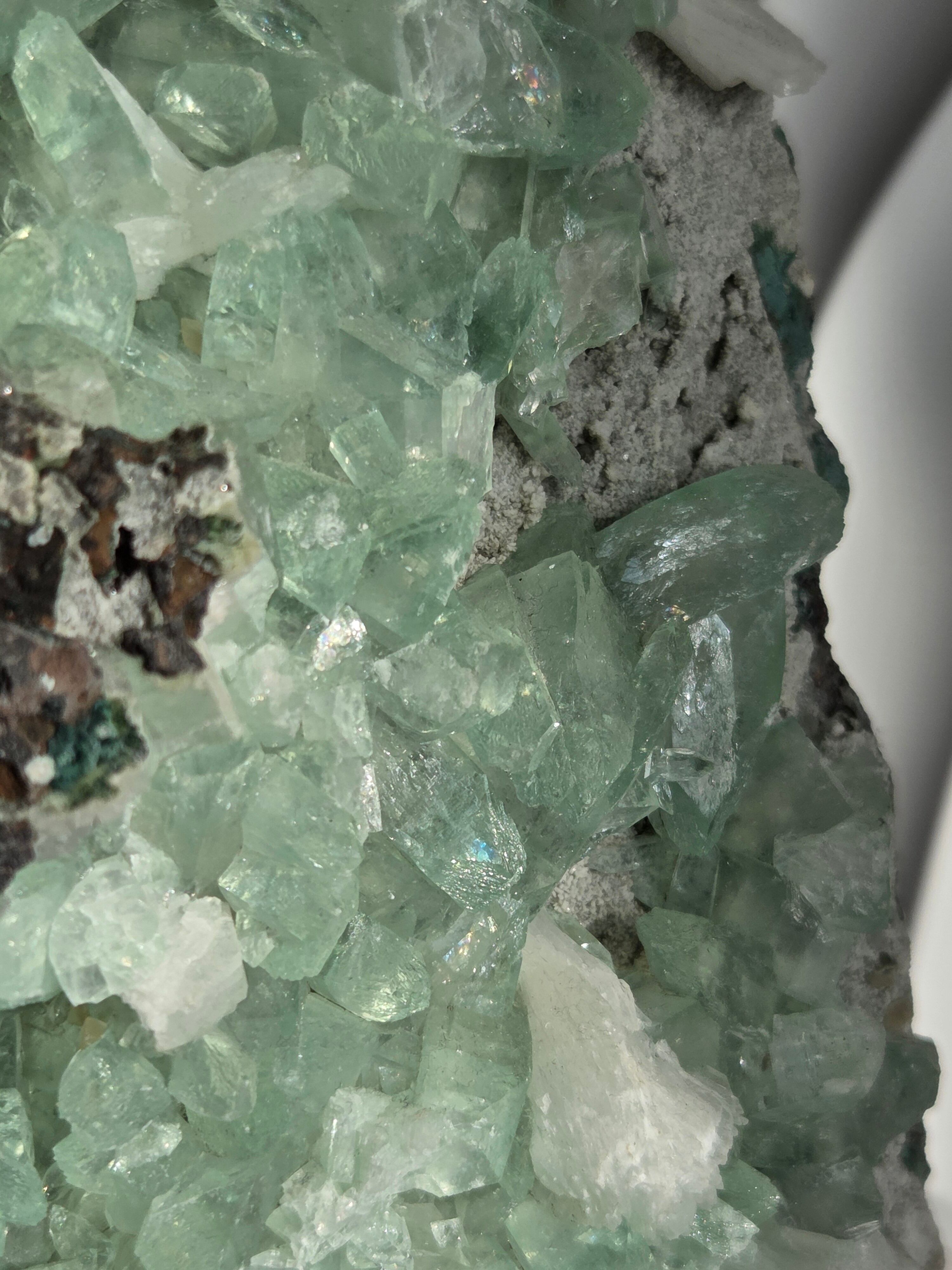 存在感抜群の大きなドームで、母岩まで美しいです。インド産のアポフィライトは、透明度があるアポフィライトが多く産出されており、年々価値があがっています。キラキラな透明感あるアポフィライトで、エメラルドグリーンカラーがとっても素敵で、沢山の虹が見え美しいです。
