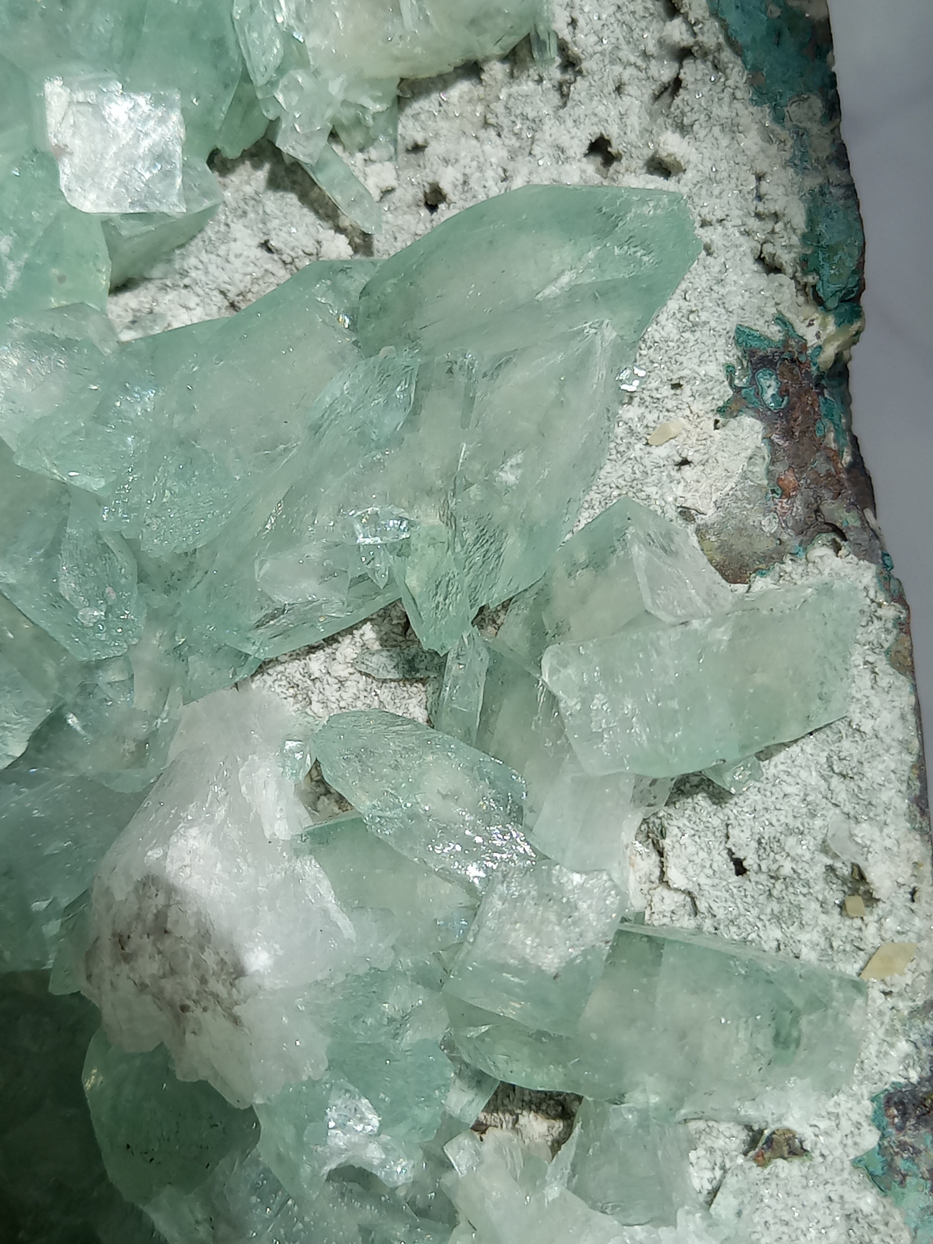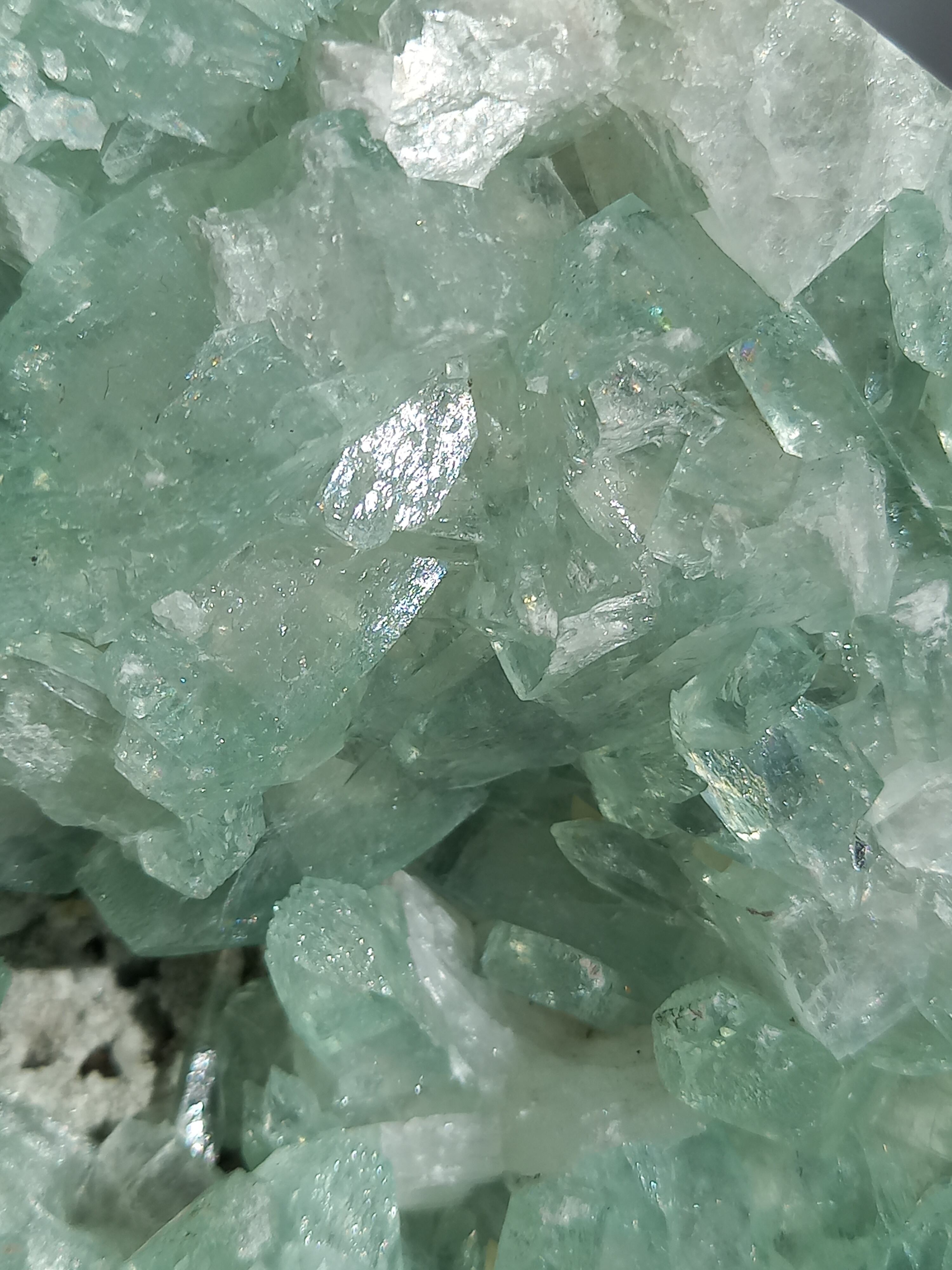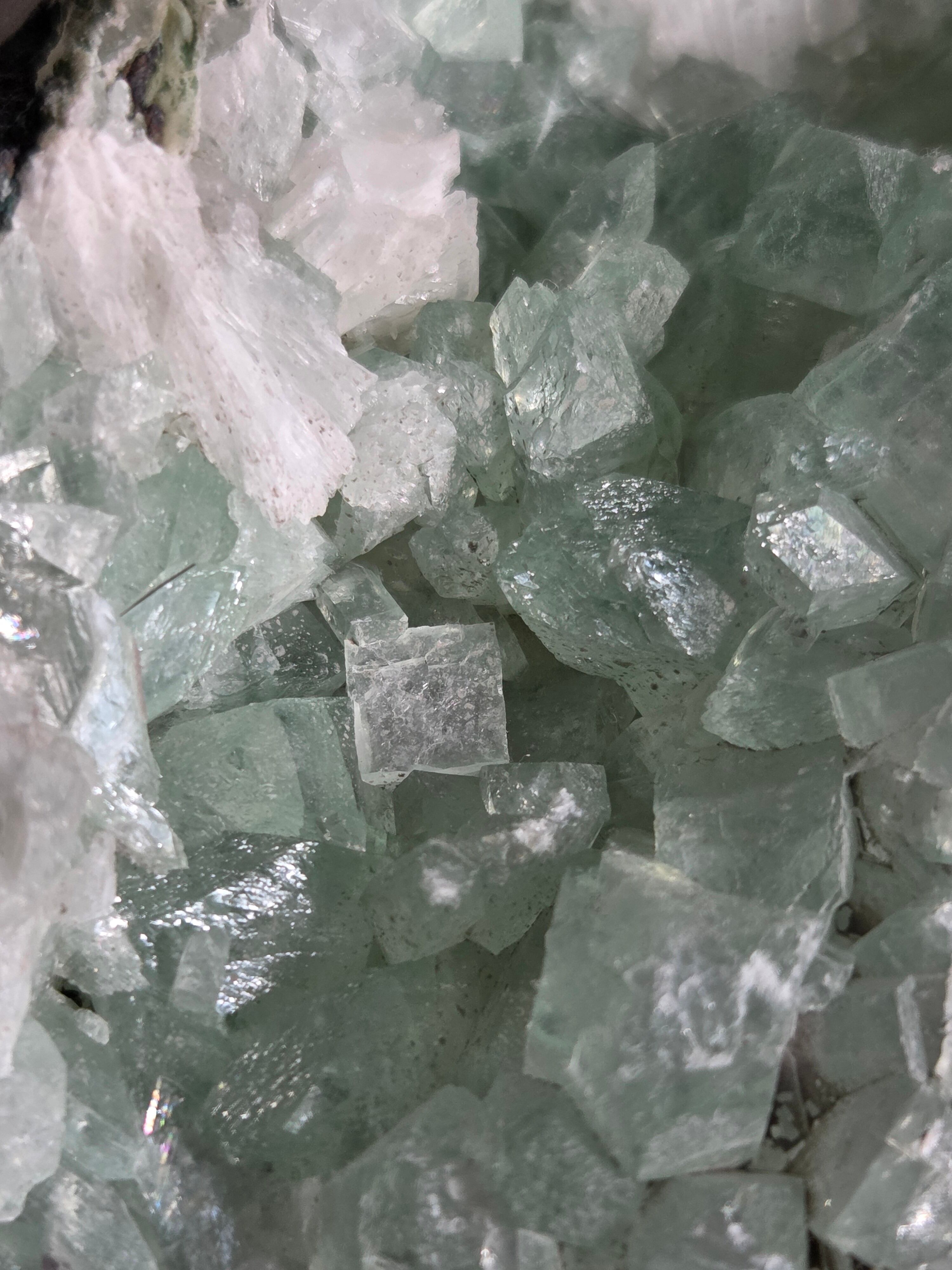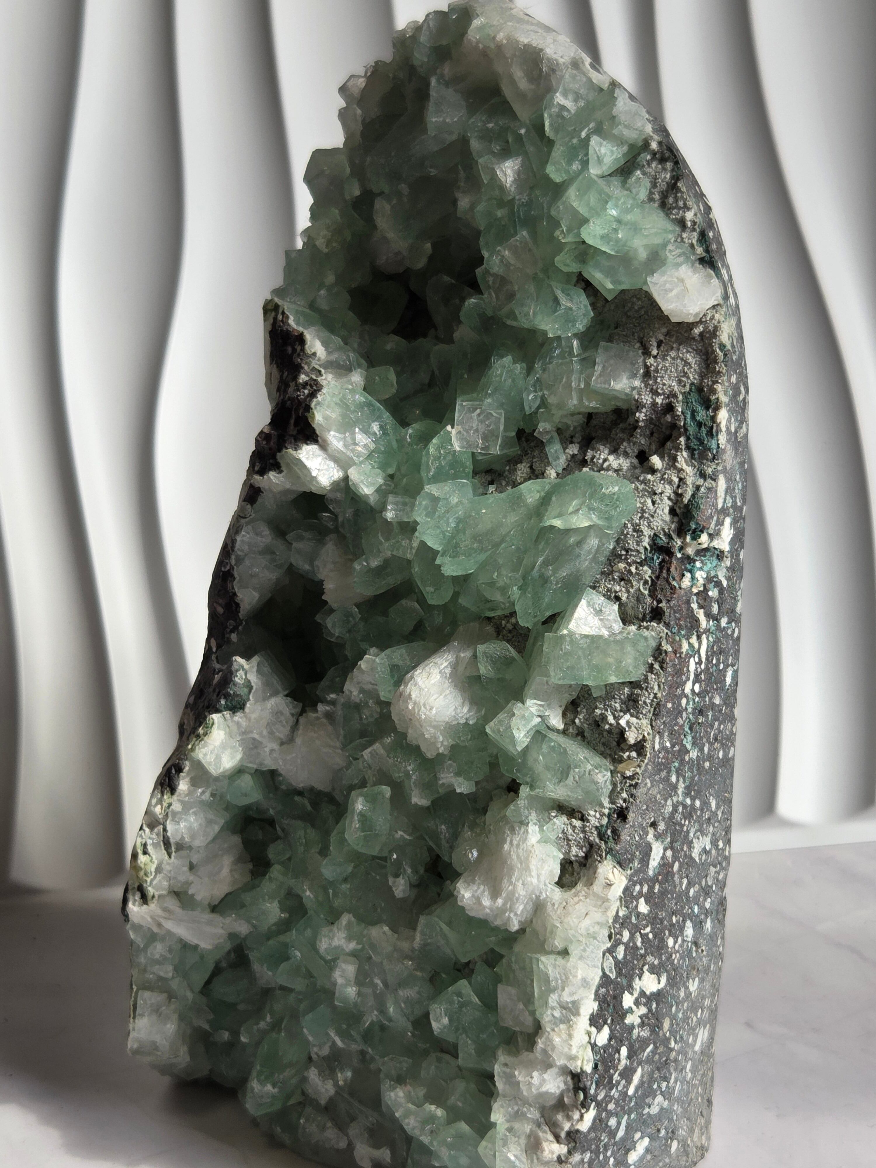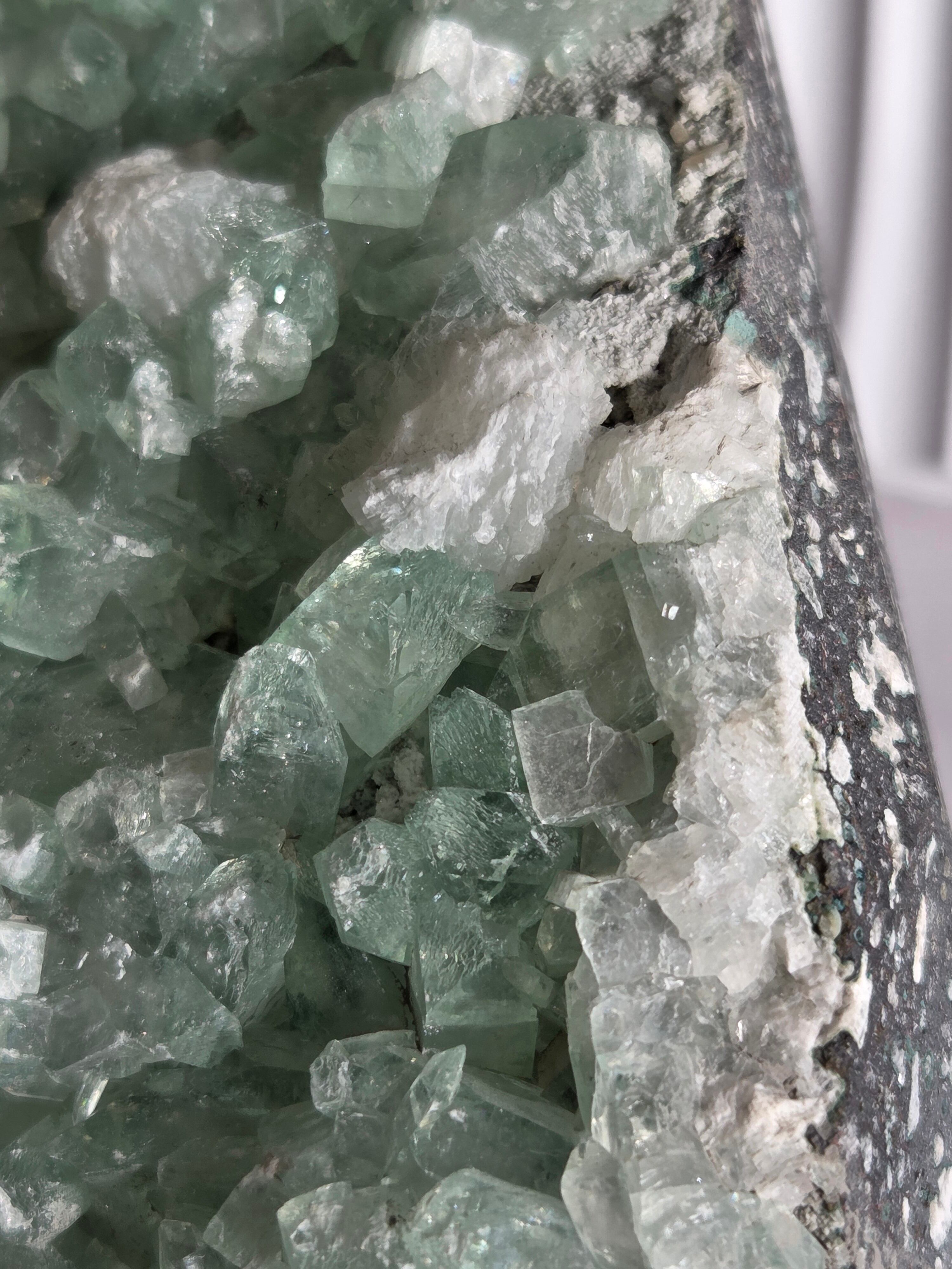 存在感抜群の大きなドームで、母岩まで美しいです。インド産のアポフィライトは、透明度があるアポフィライトが多く産出されており、年々価値があがっています。キラキラな透明感あるアポフィライトで、エメラルドグリーンカラーがとっても素敵で、沢山の虹が見え美しいです。