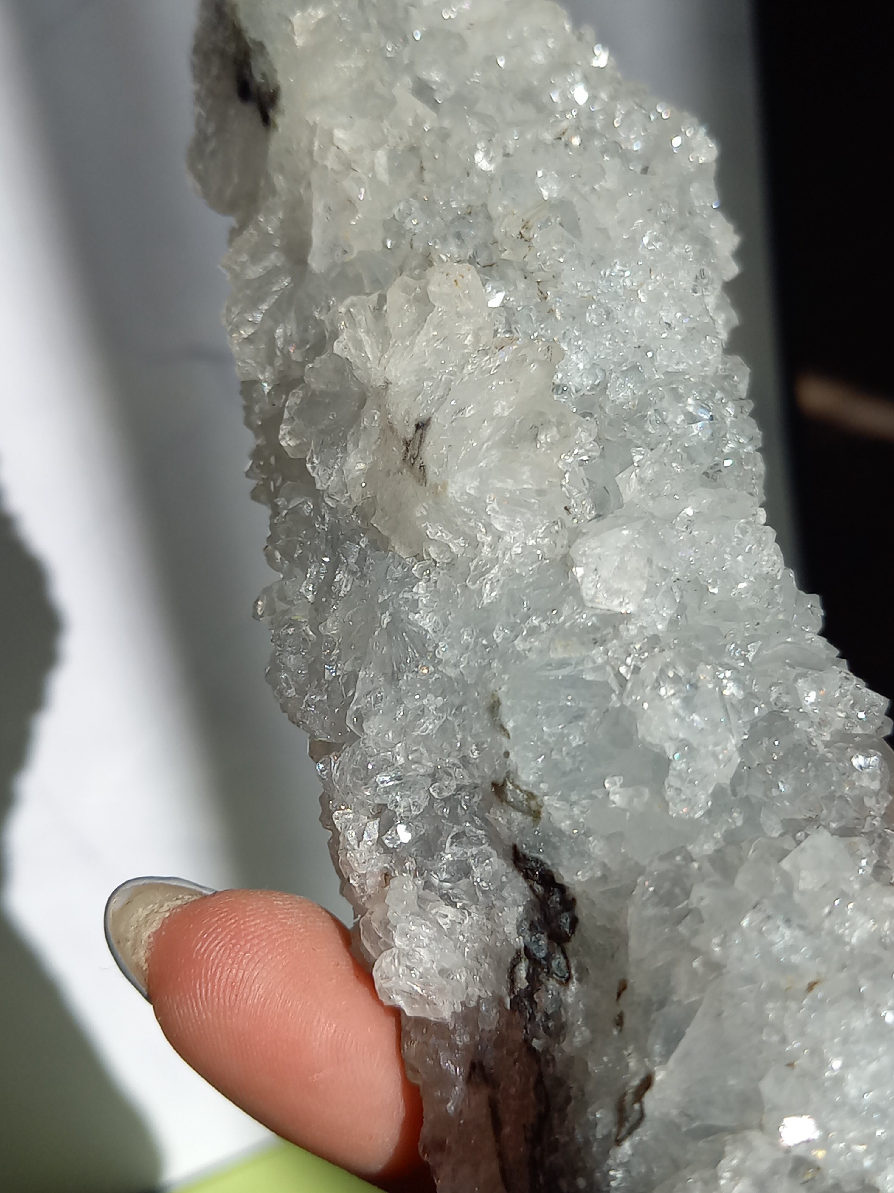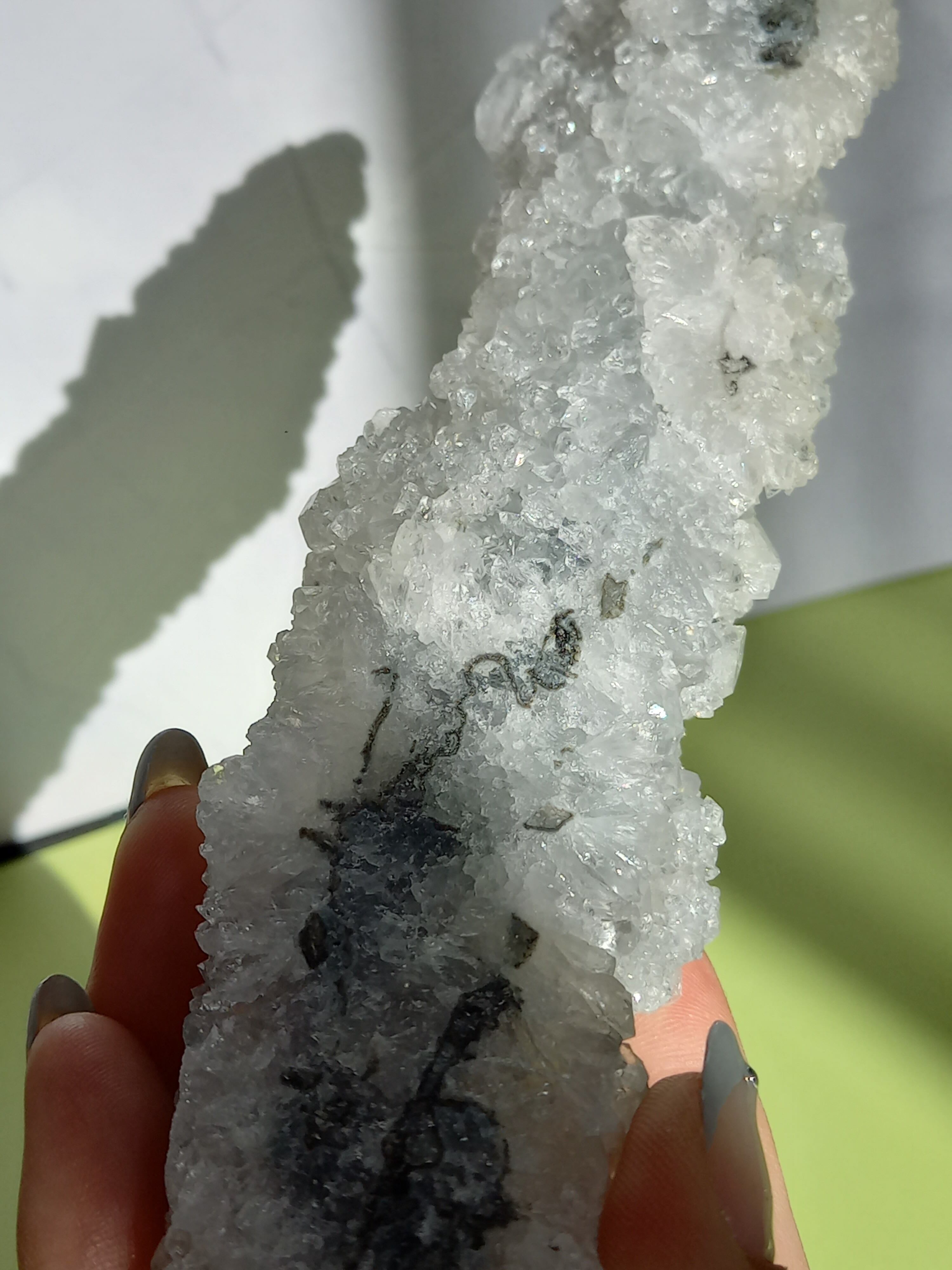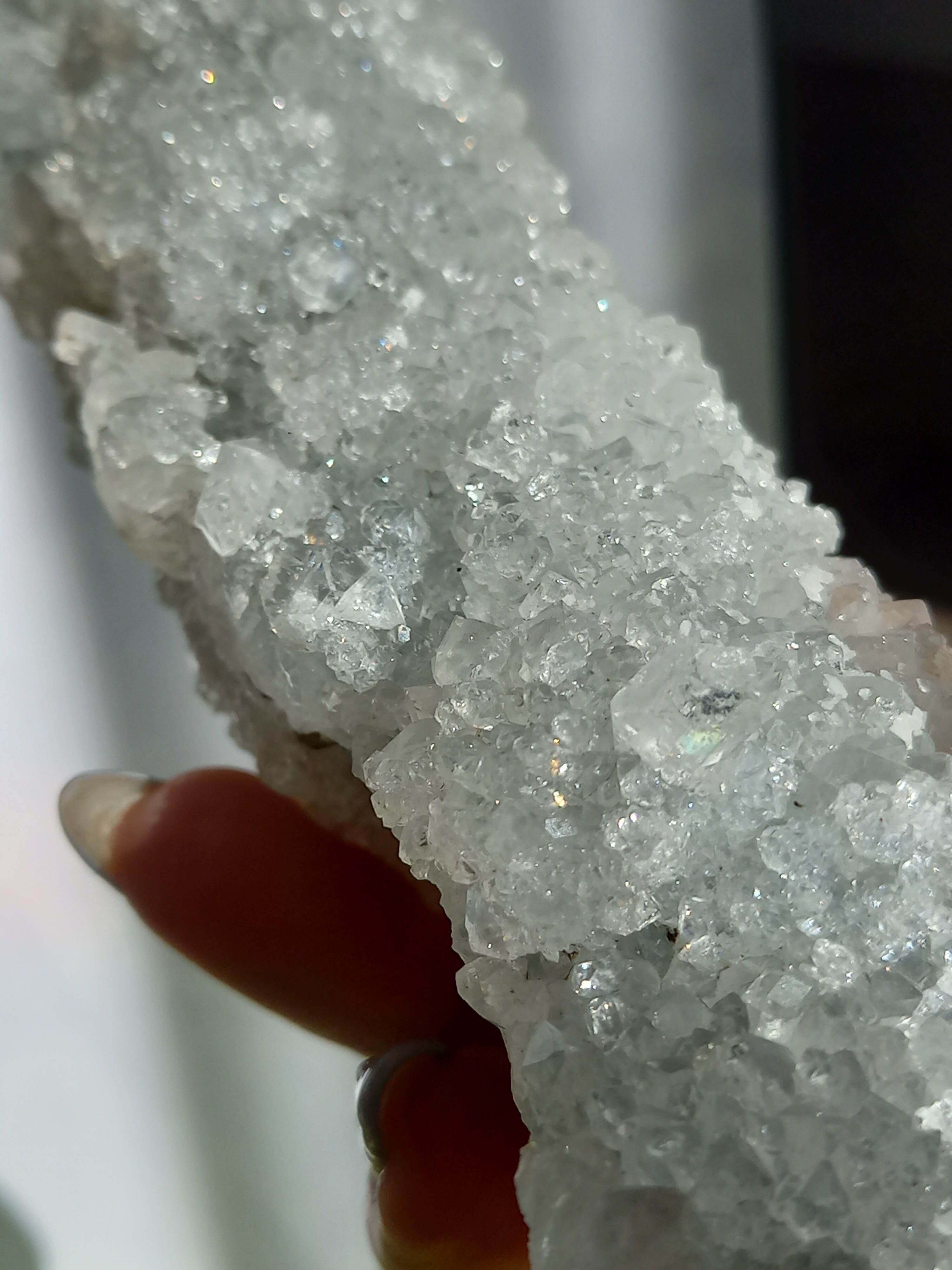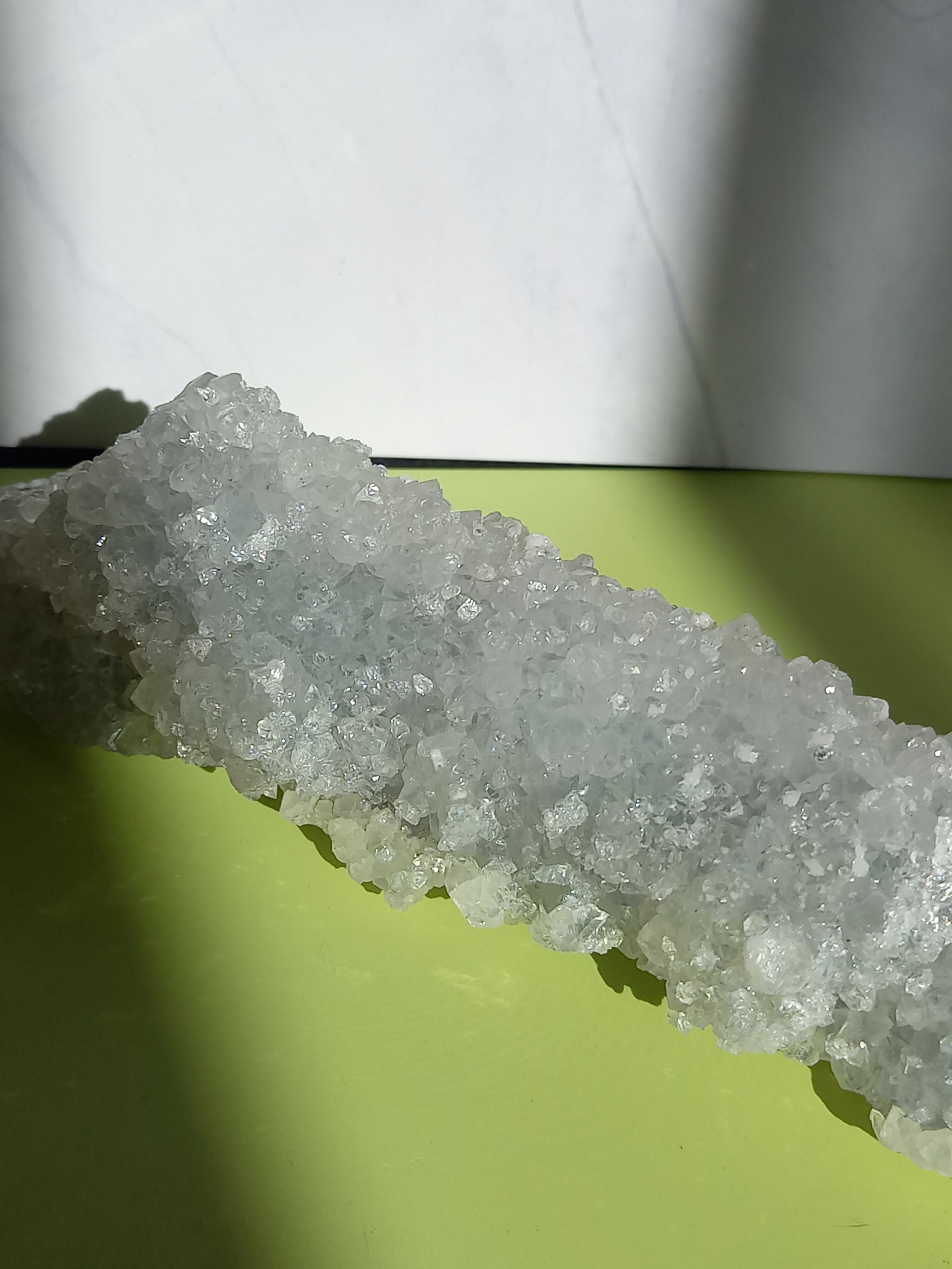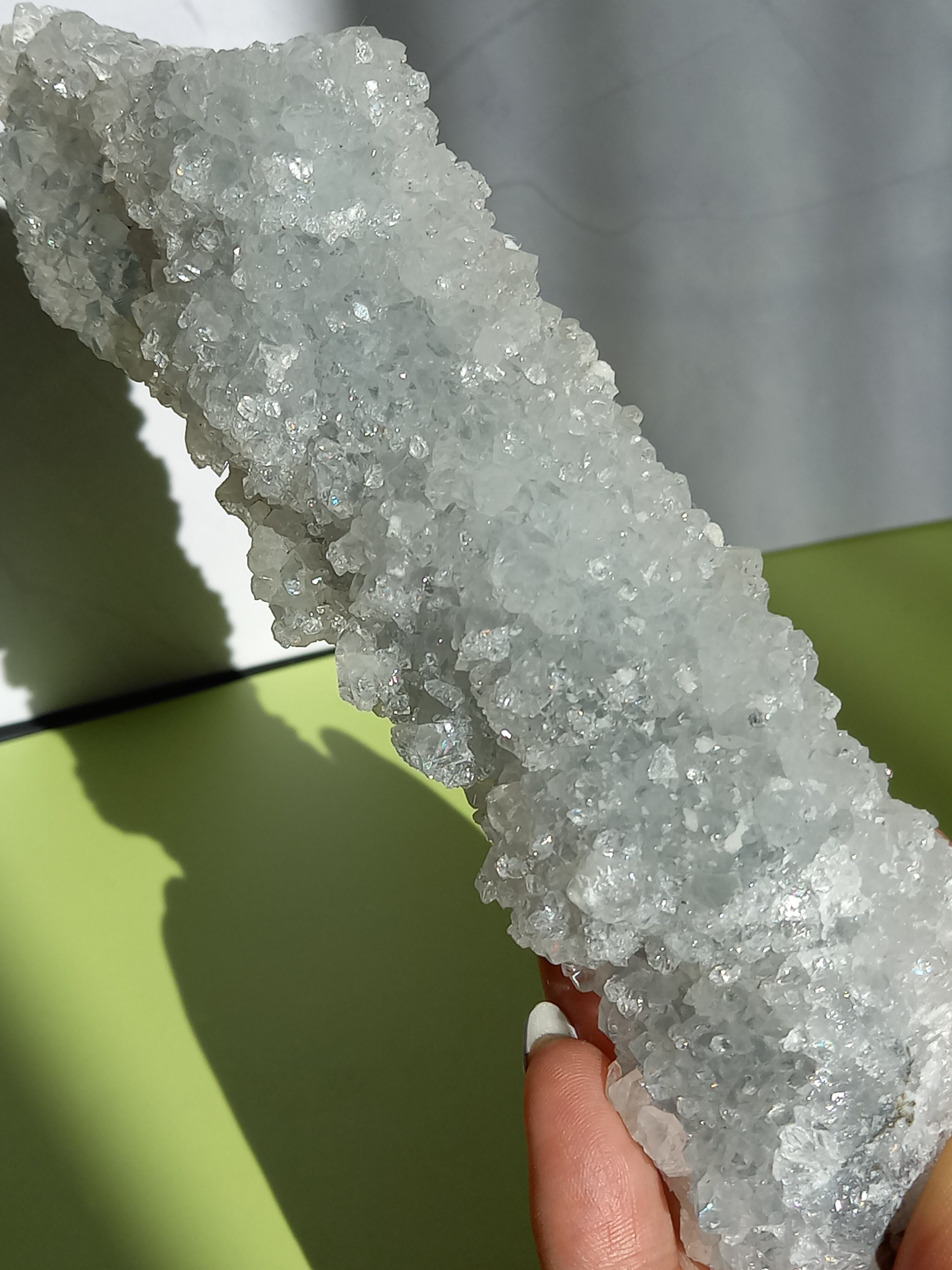 長い棒状にできた結晶で、みずみずしい、うるうるキラキラのアポフィライト で結晶は透明感があります。