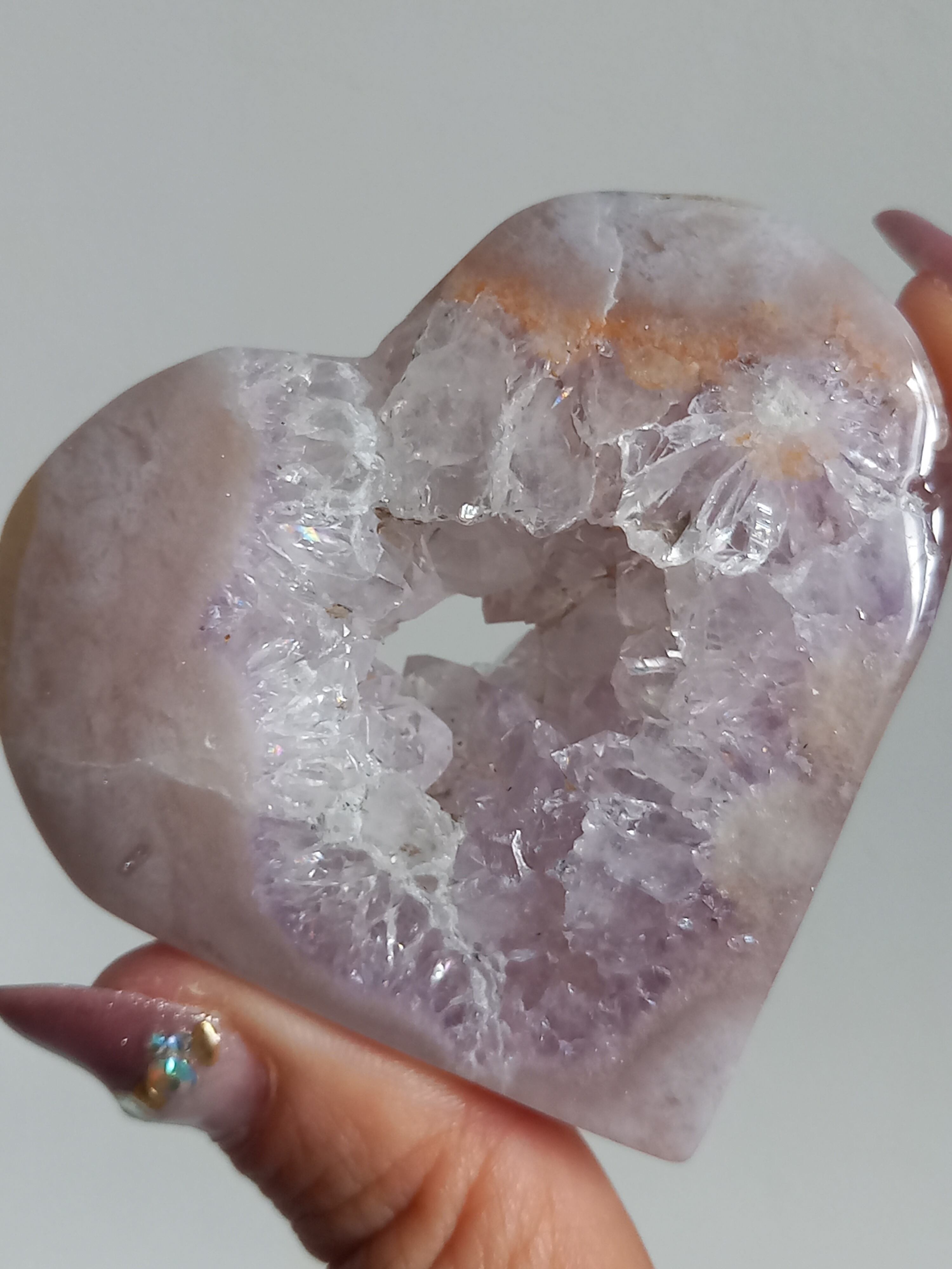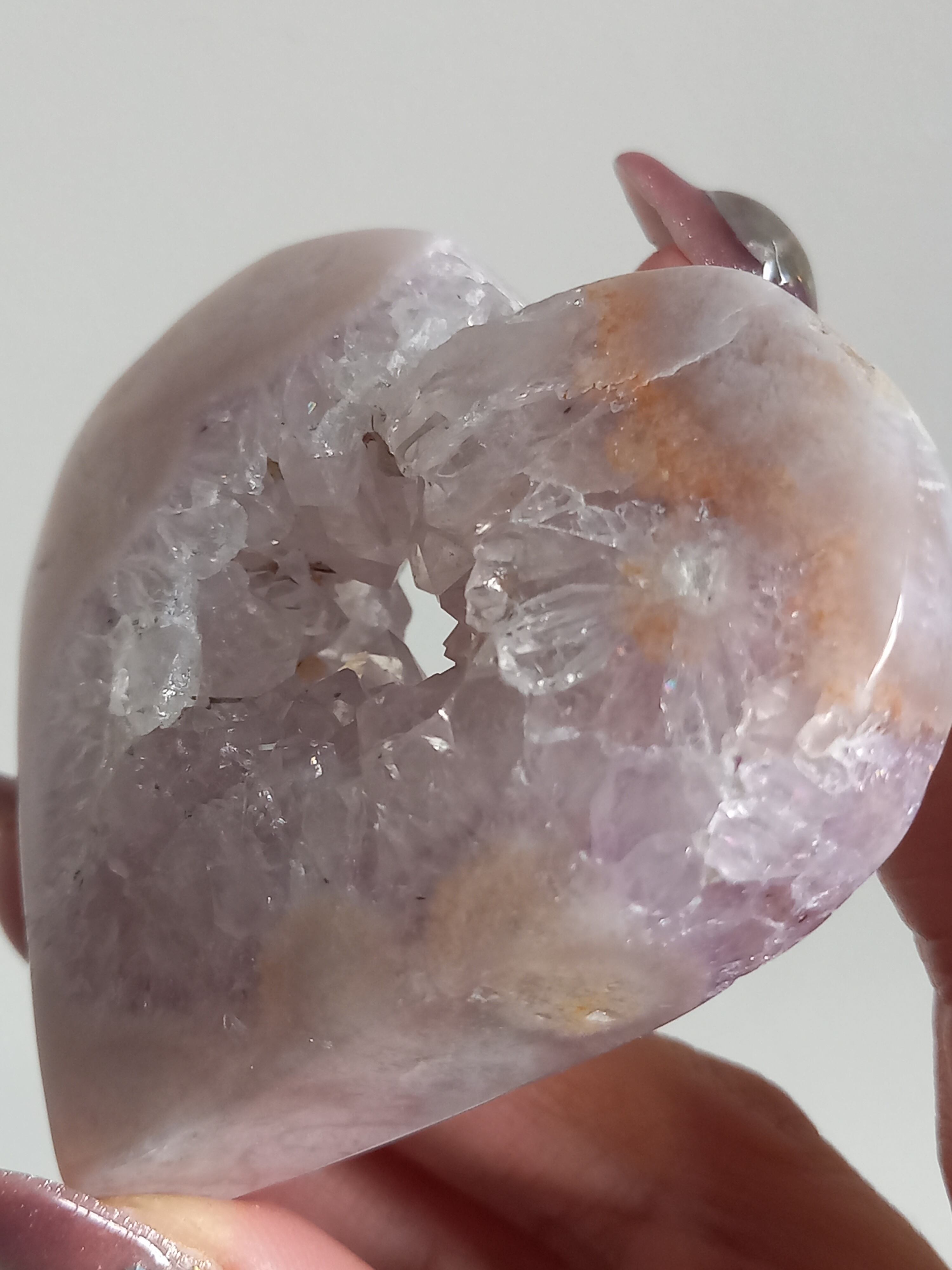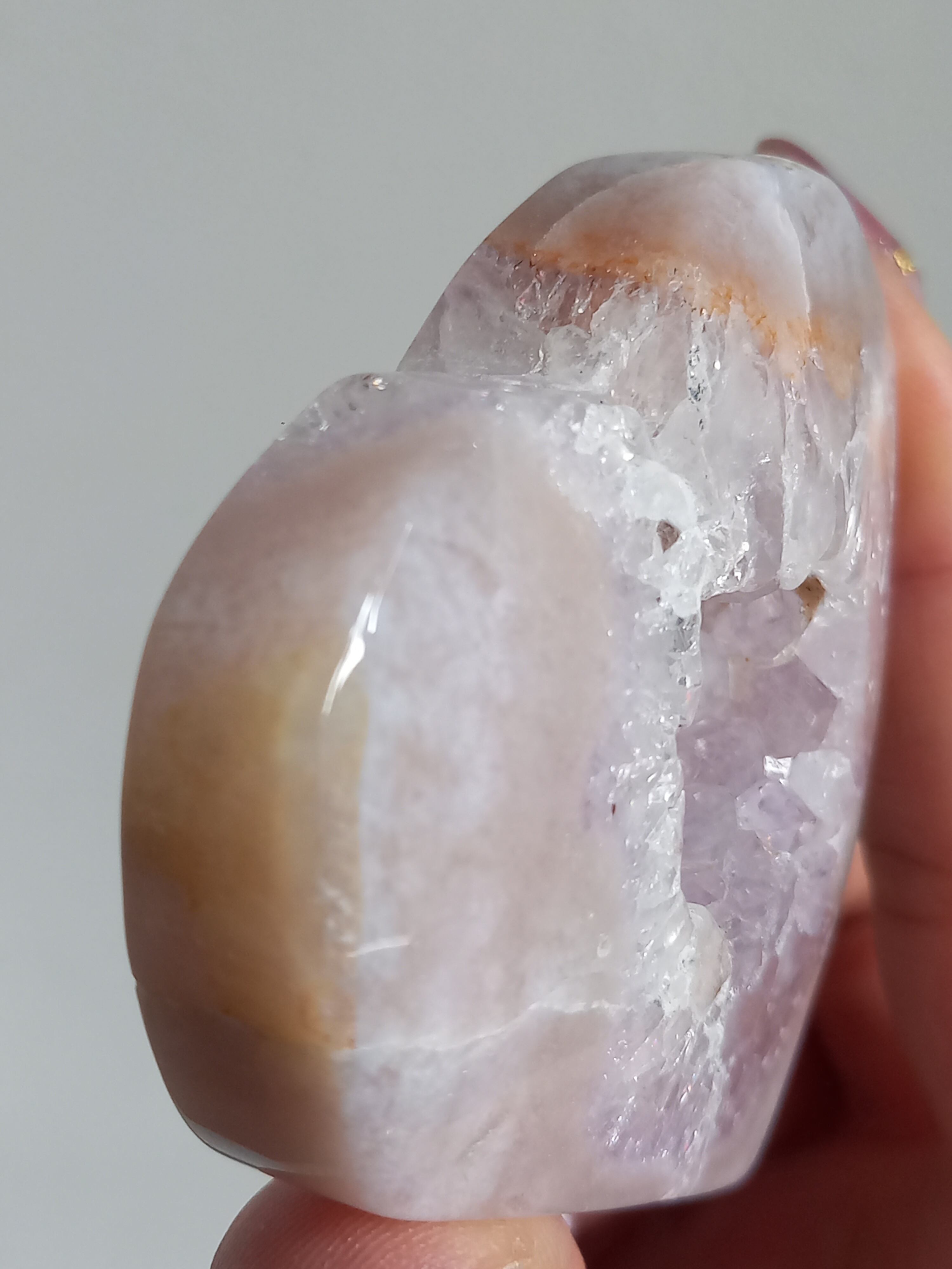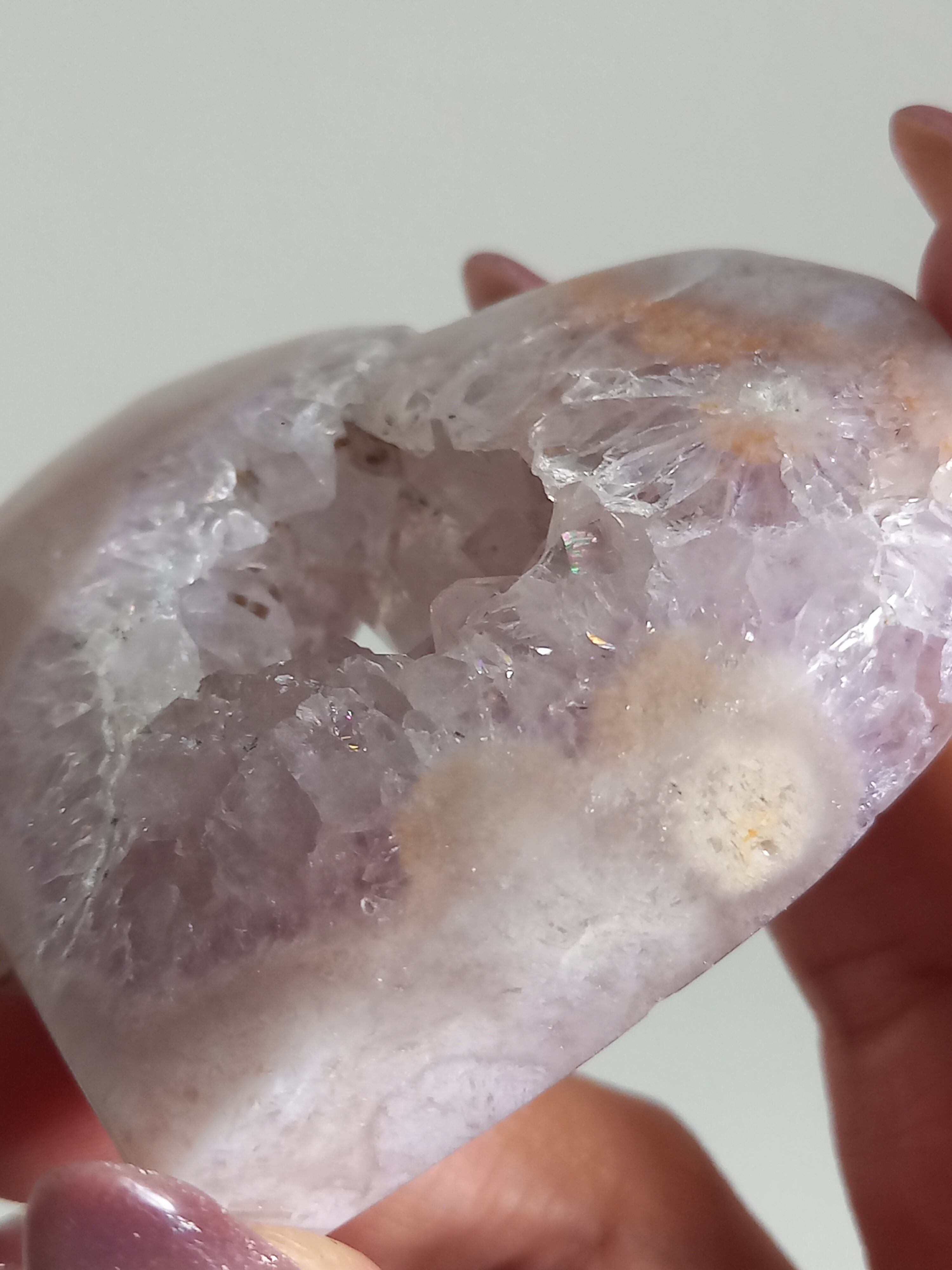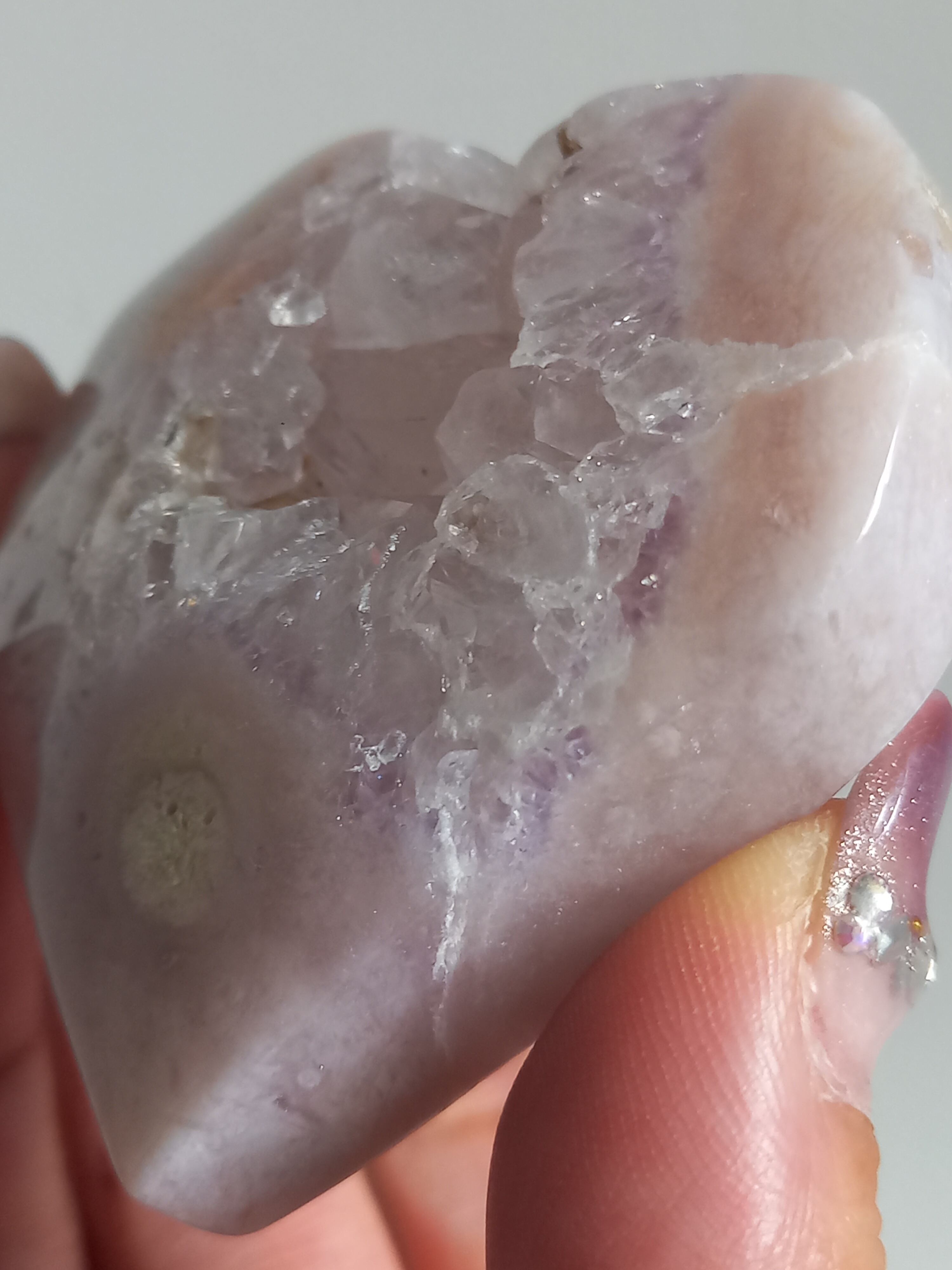 アメジストに、フラワーアゲートが共生したハートパームになります。