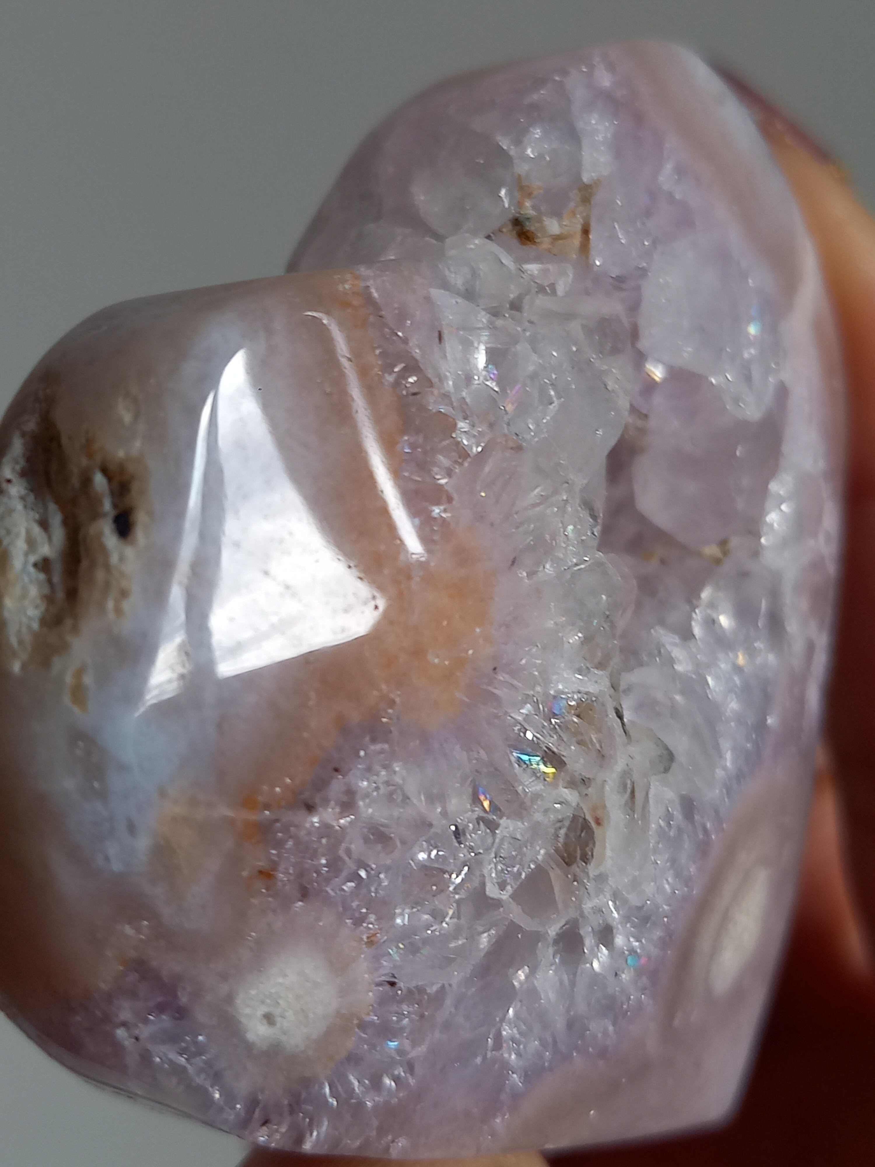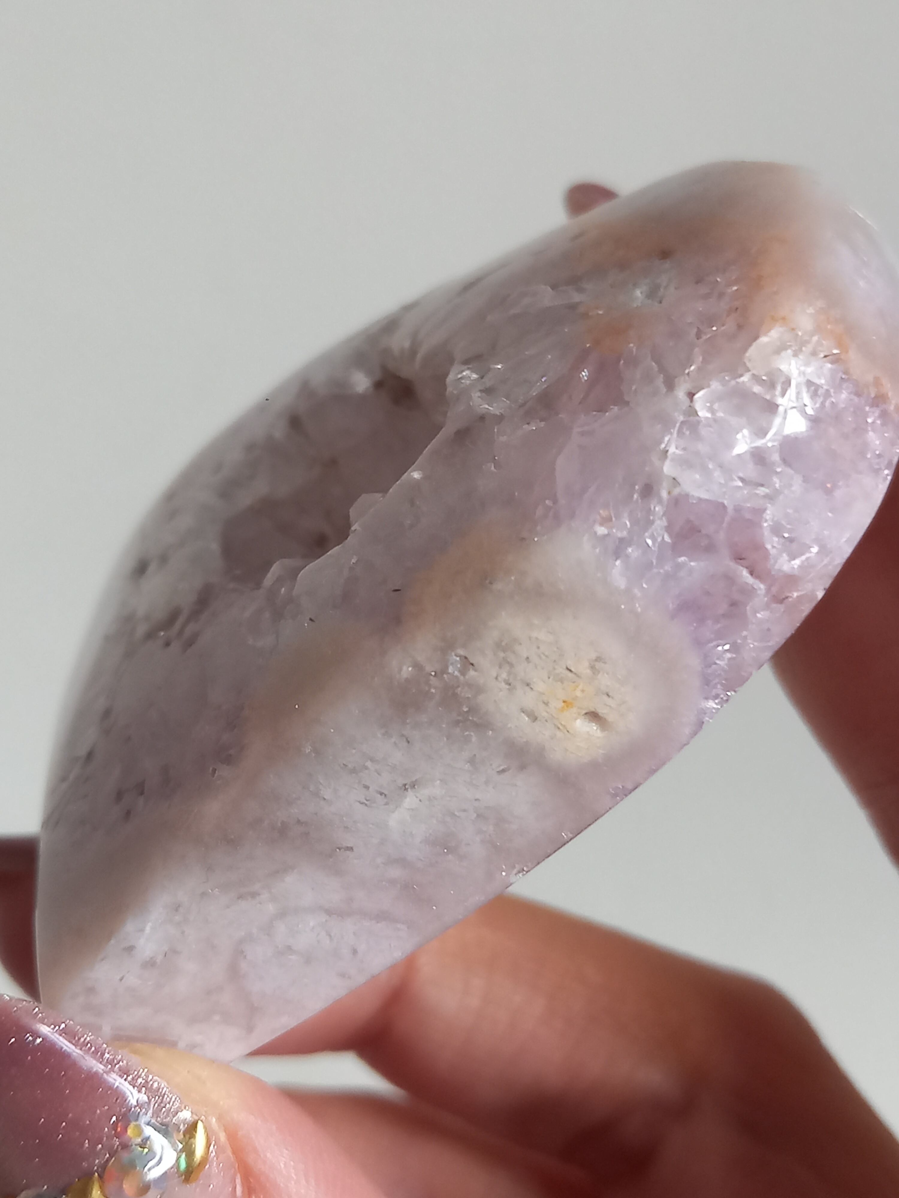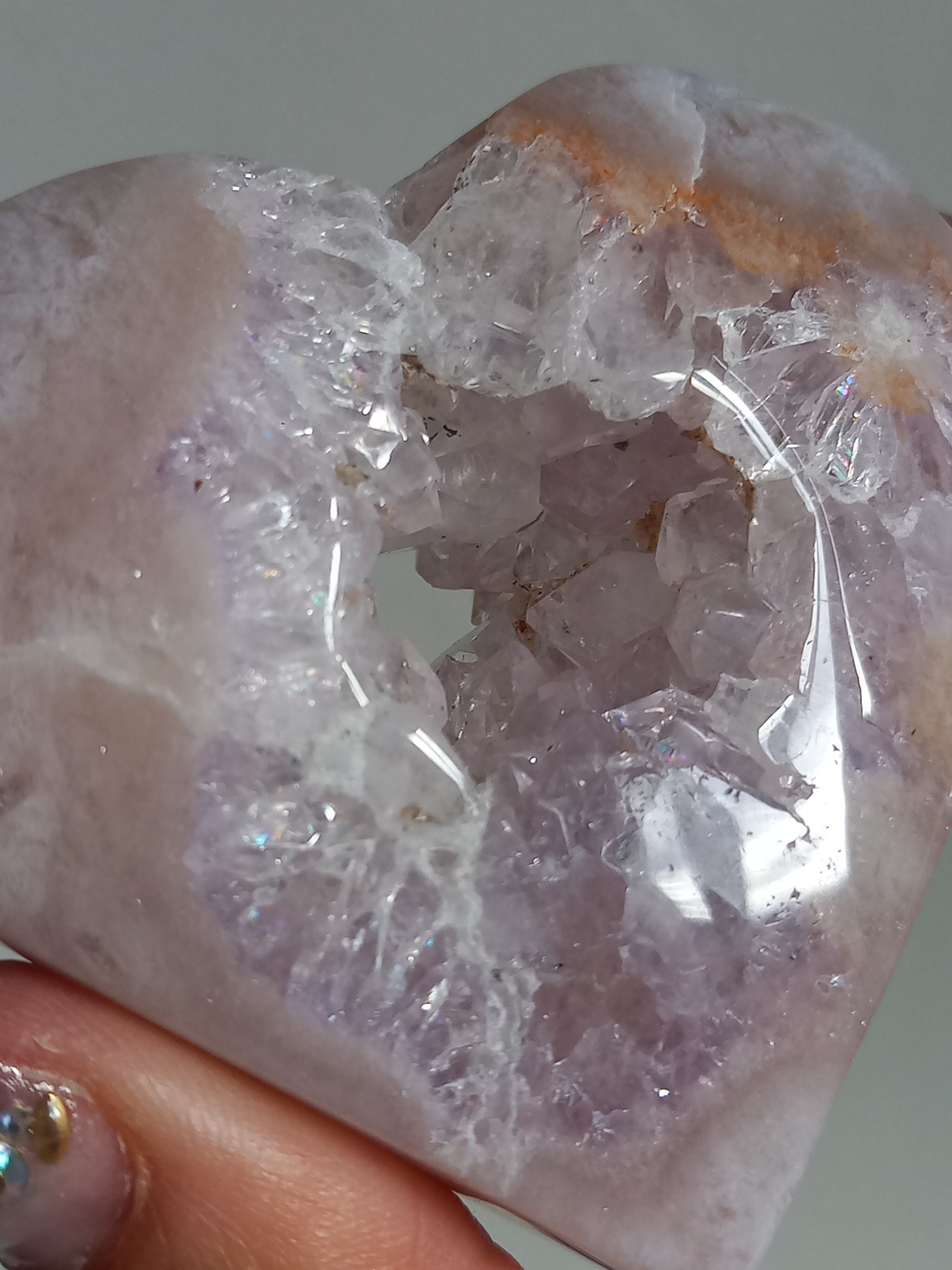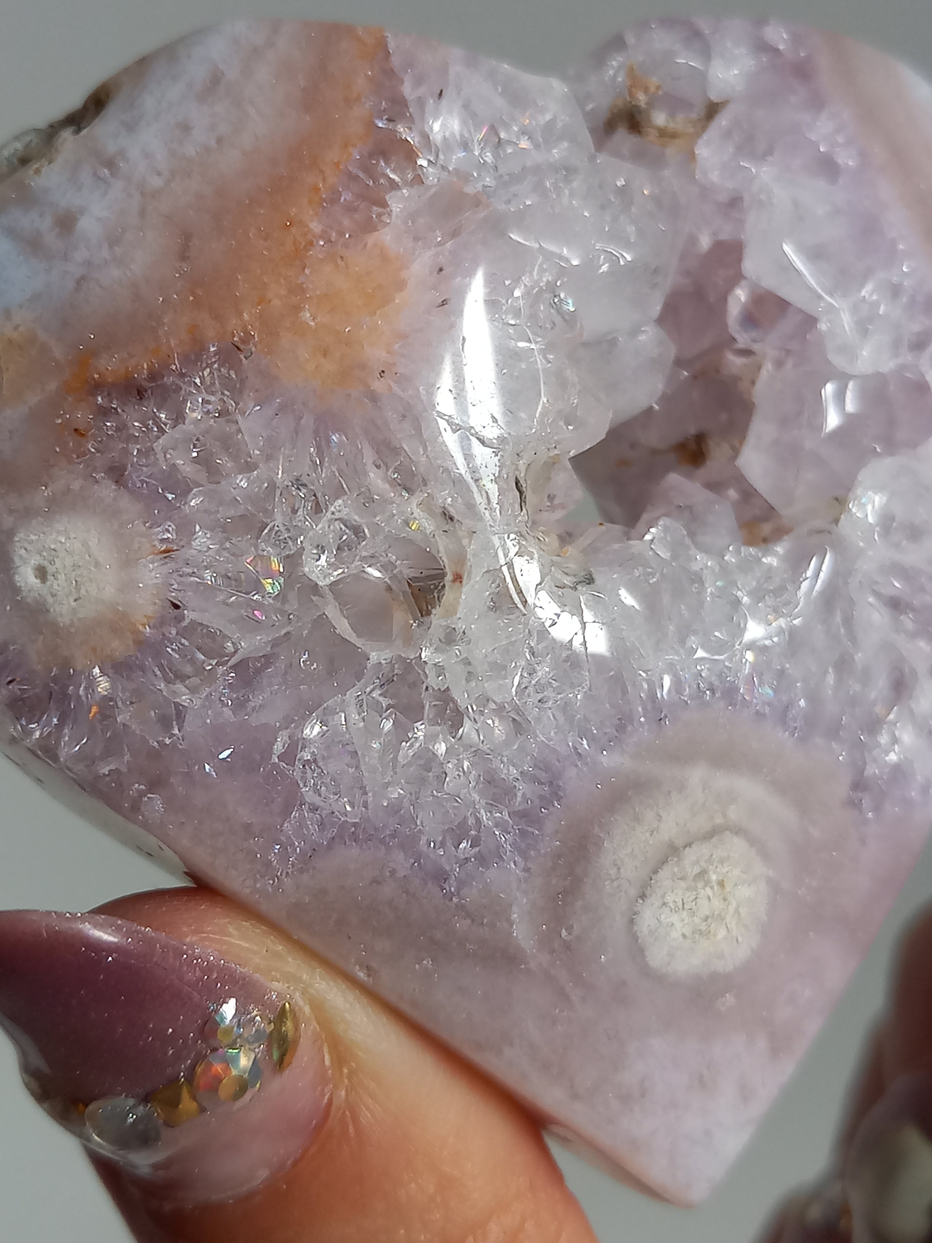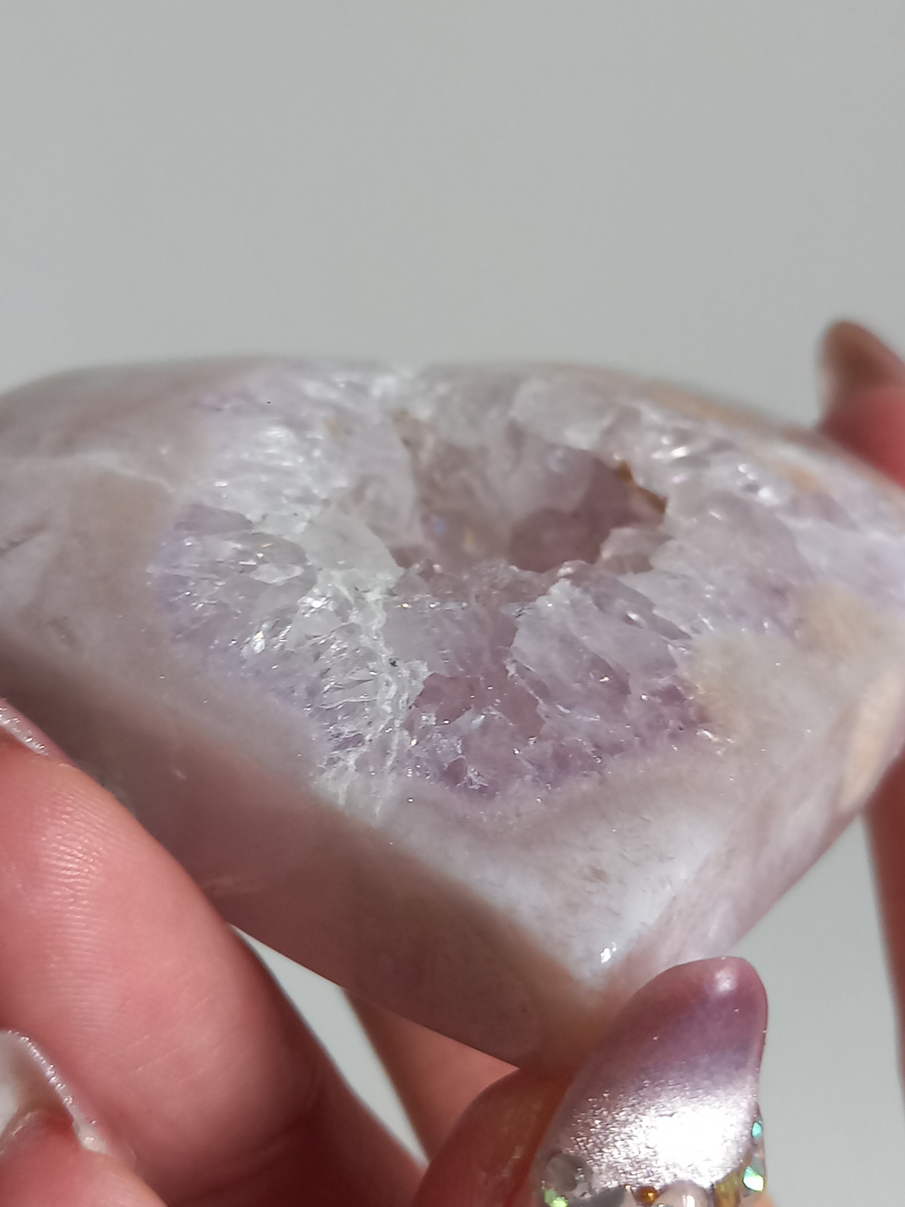 アメジストに、フラワーアゲートが共生したハートパームになります。