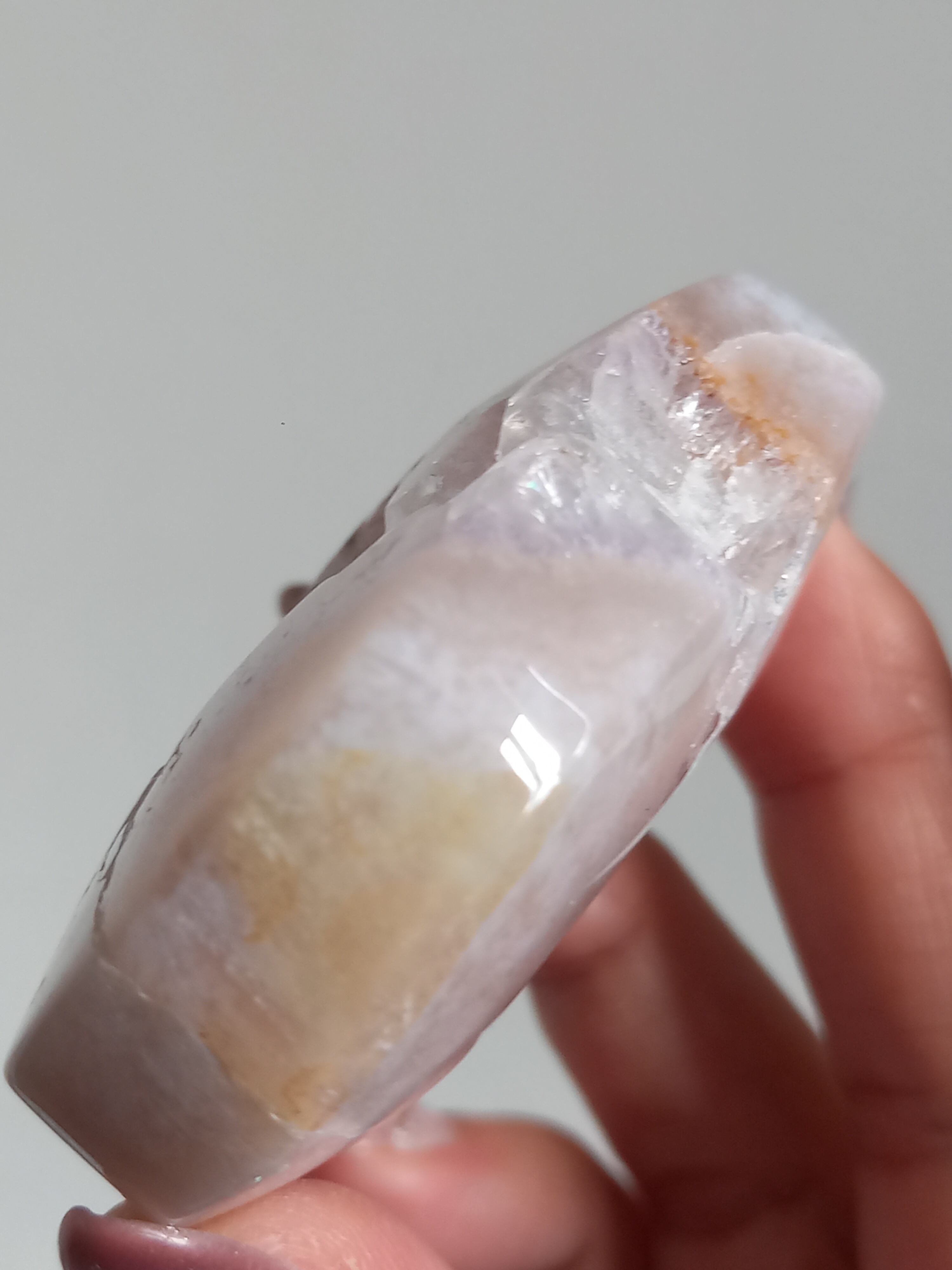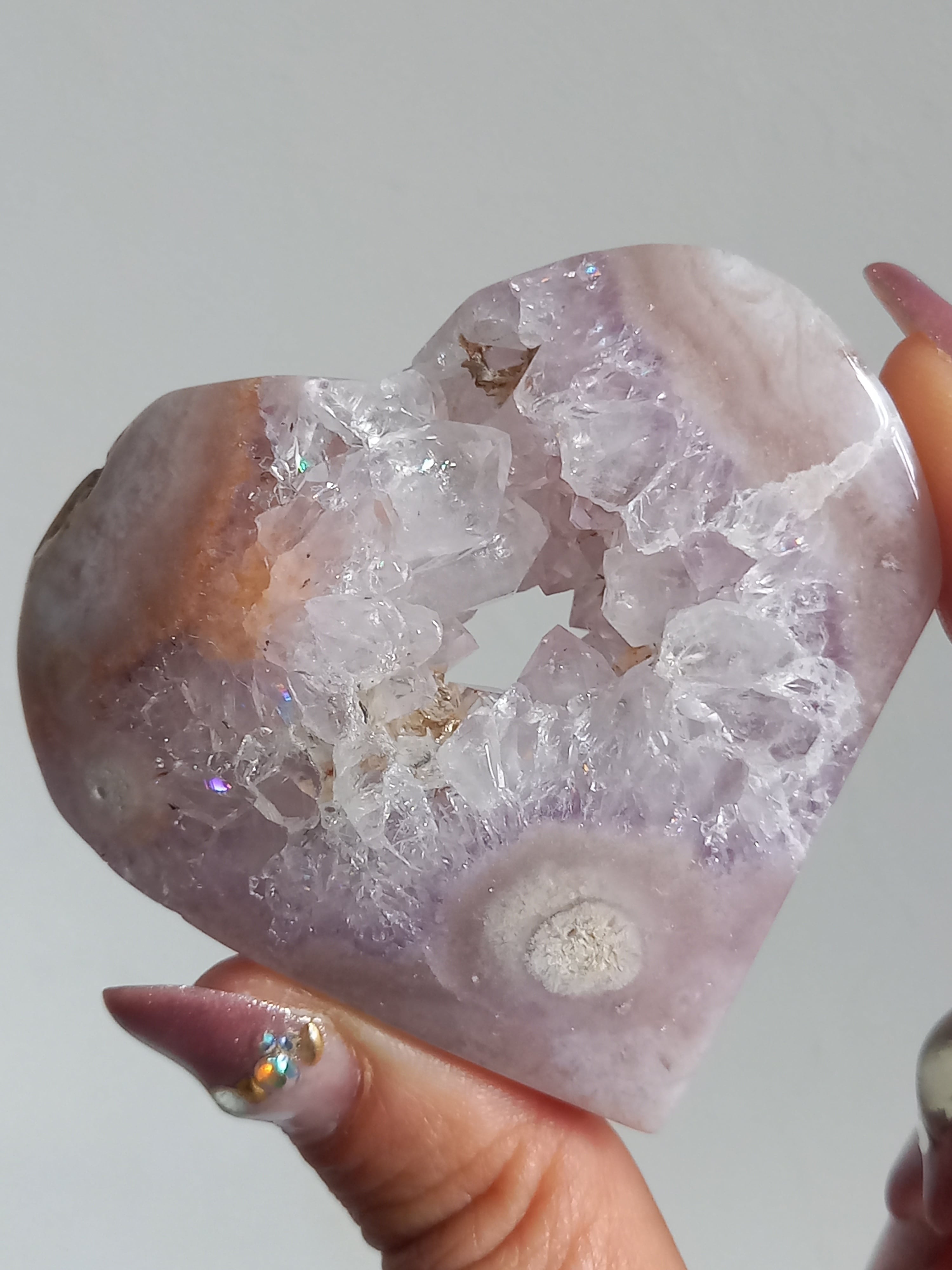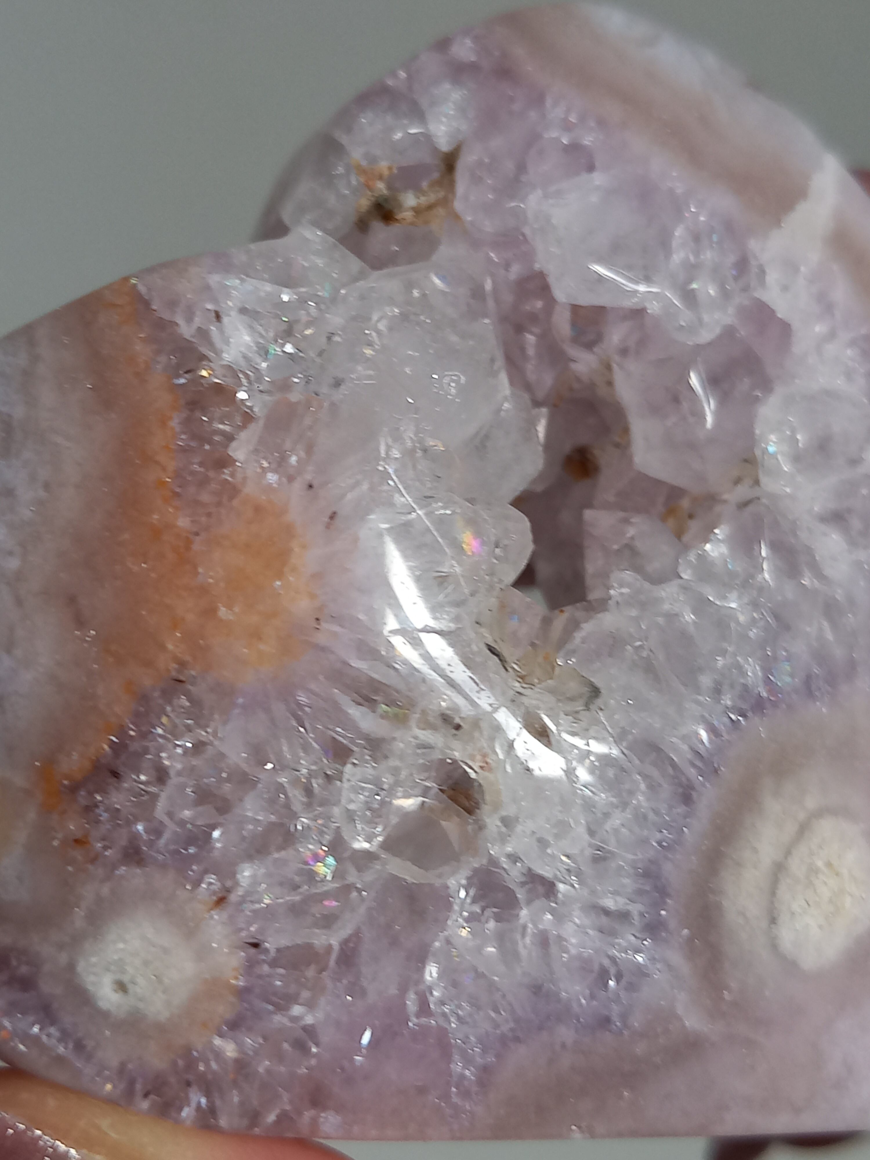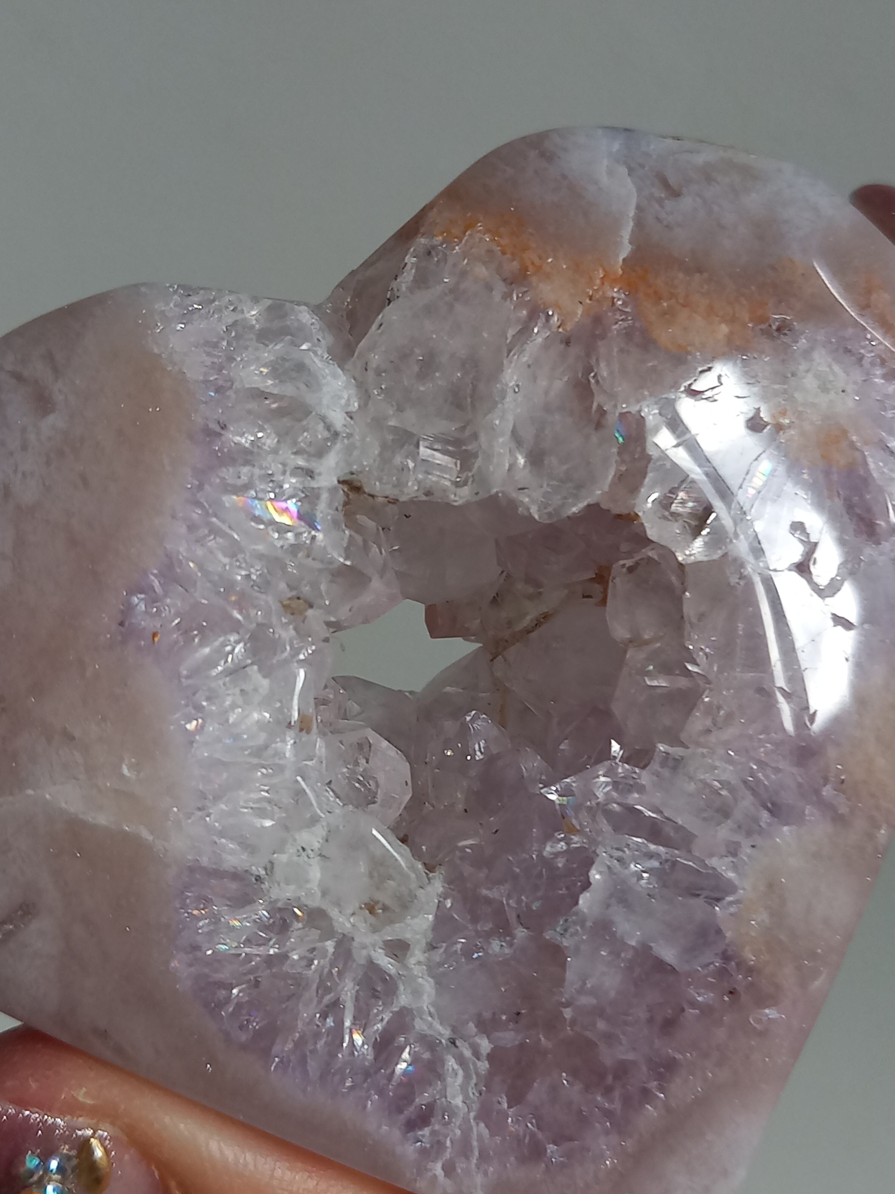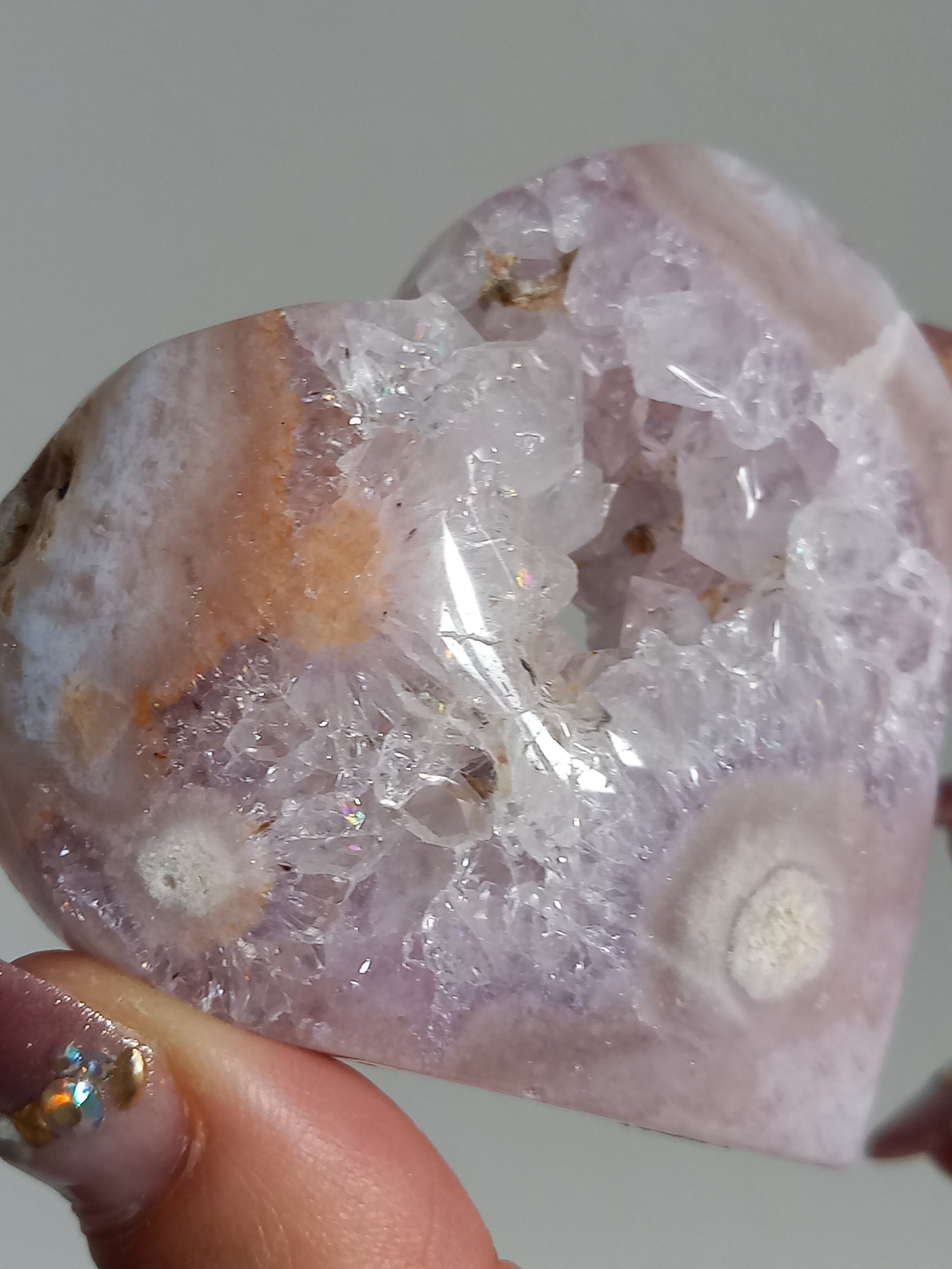 アメジストに、フラワーアゲートが共生したハートパームになります。