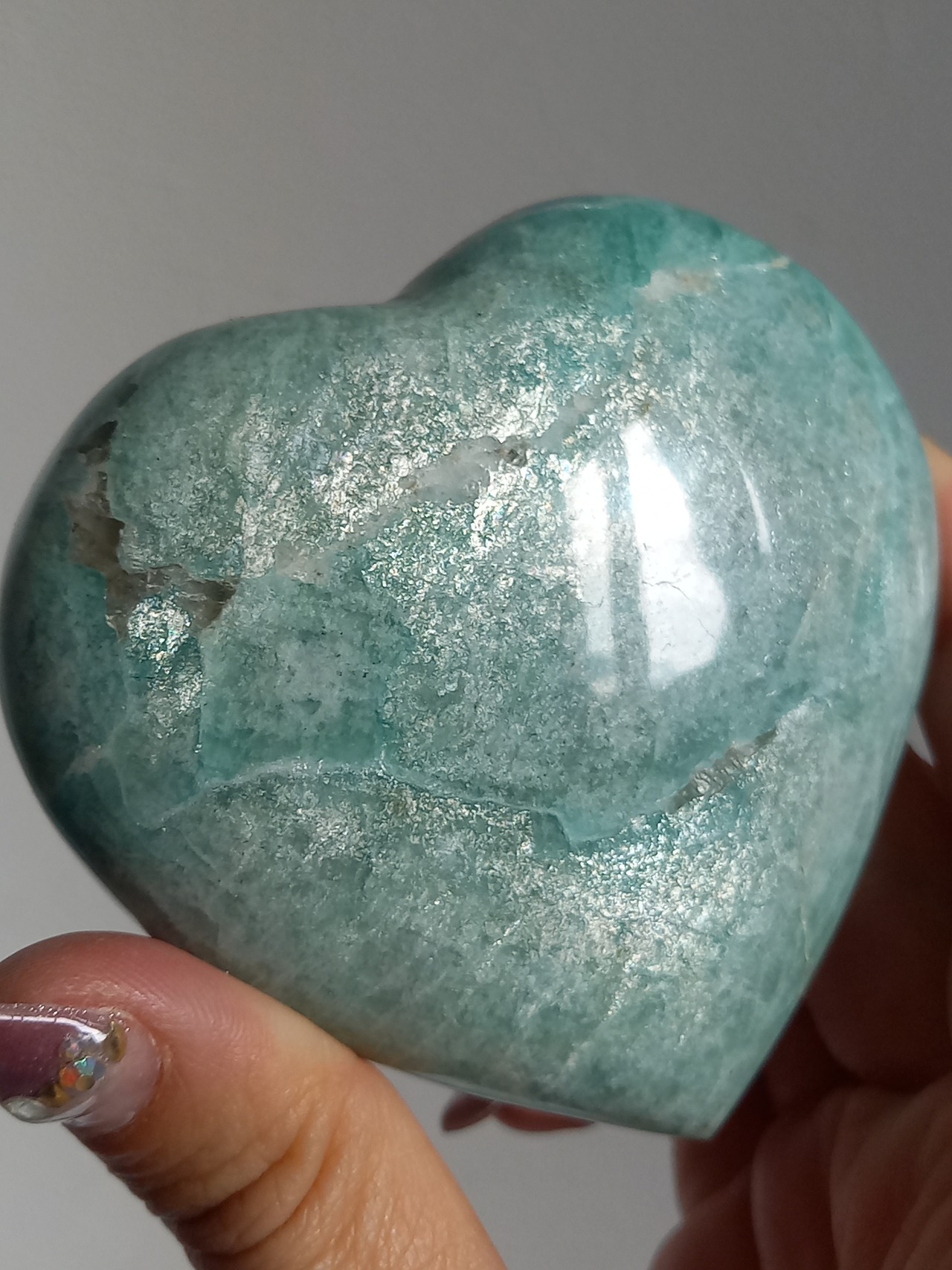 エメラルドグリーンとシラーが美しいアマゾナイトのハートパームです。